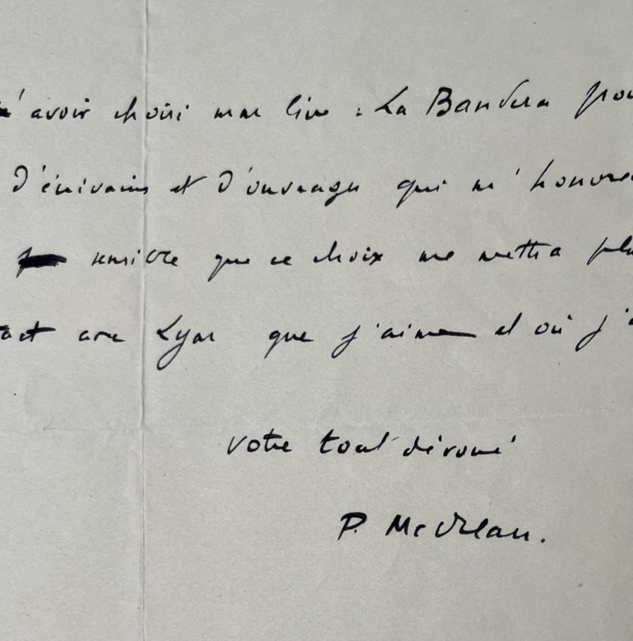 "Je vous remercie d'avoir choisi mon livre : La bandera [Gallimard, 1931] pour le joindre à une liste d'écrivains et d'ouvrages qui m'honorent. Je suis d'autant plus sensible que ce choix me mettra plus cordialement en contact avec Lyon que j'aime et où j'ai beaucoup d'amis. Votre tout dévoué. P. Mc Orlan".