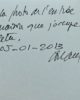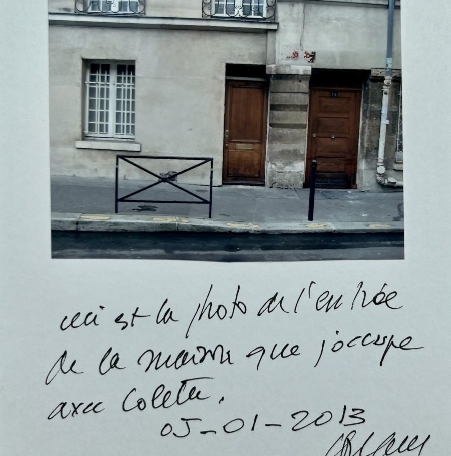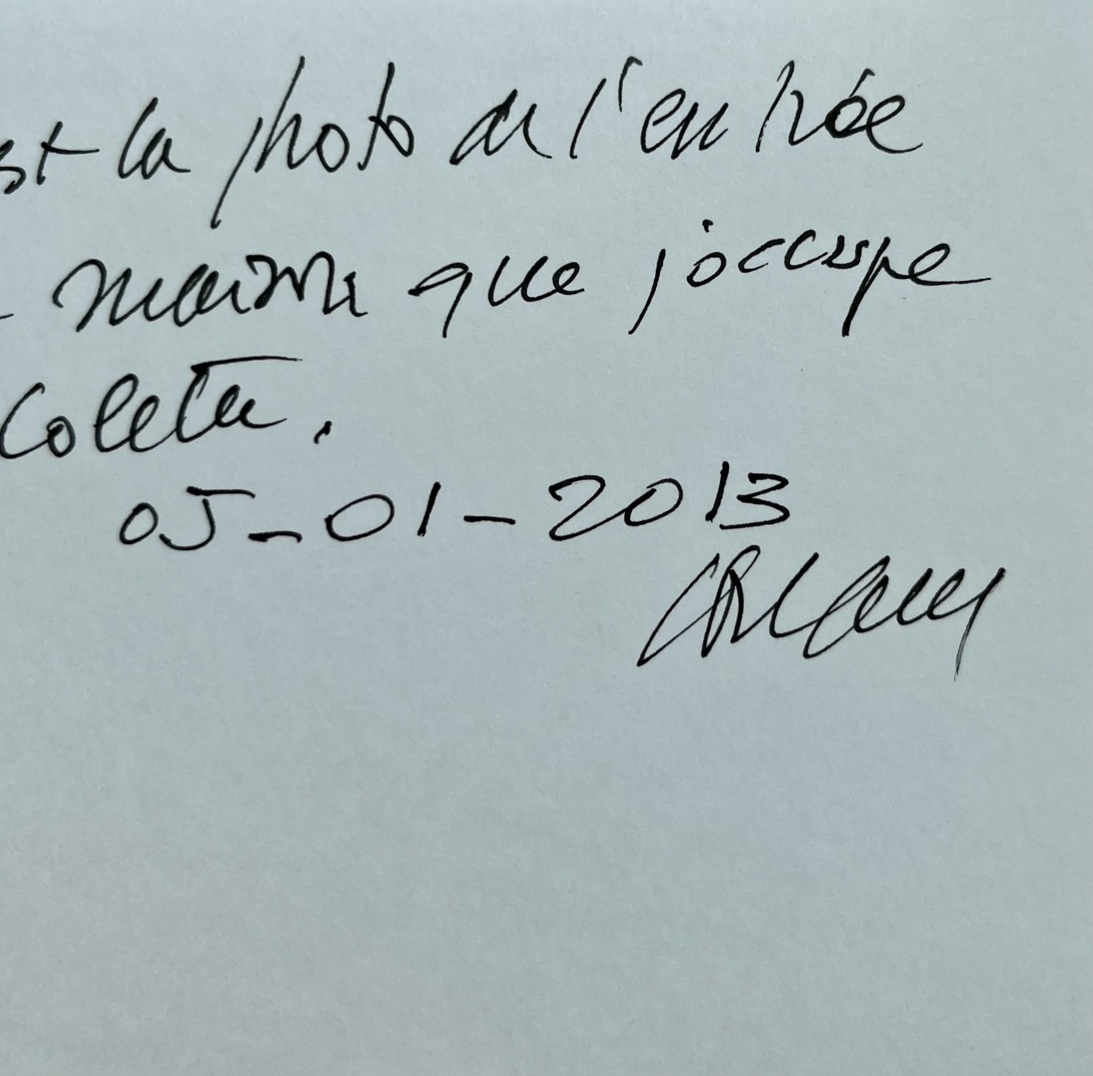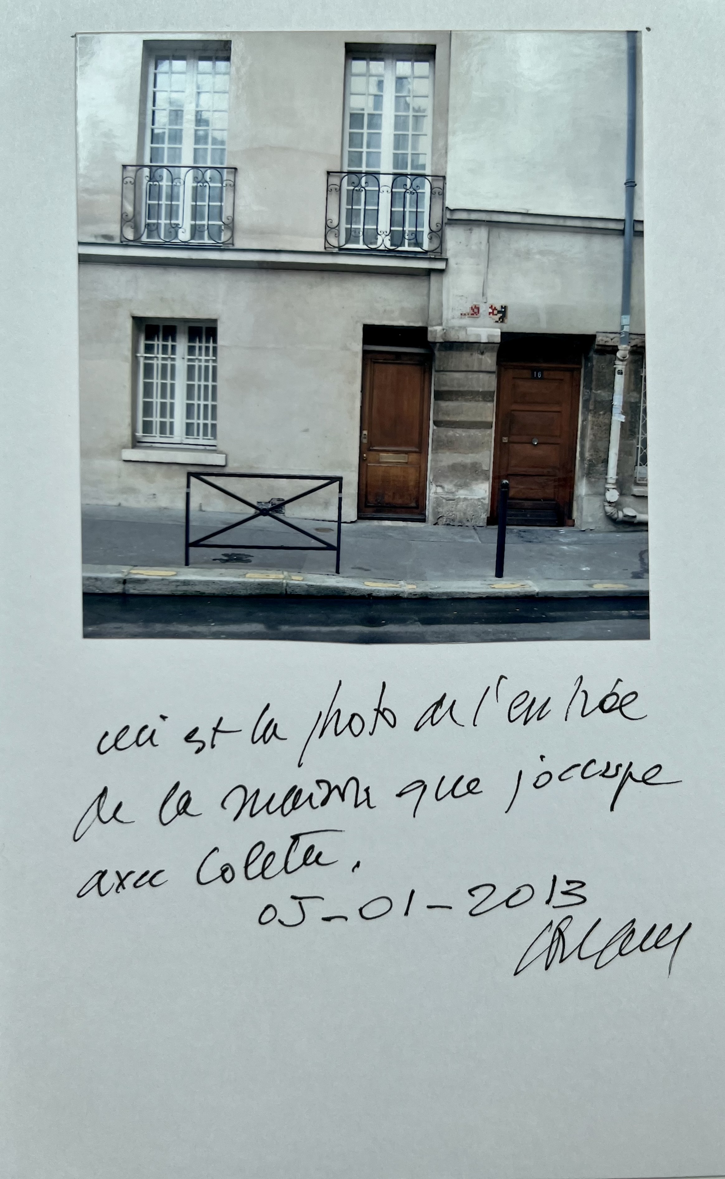 Sous une photographie originale de l'entrée de sa maison, montée sur bristol, Pierre Soulages a inscrit ces quelques mots : "Ceci est la photo de l'entrée de la maison que j'occupe avec Colette. 05-01-2013. Soulages".