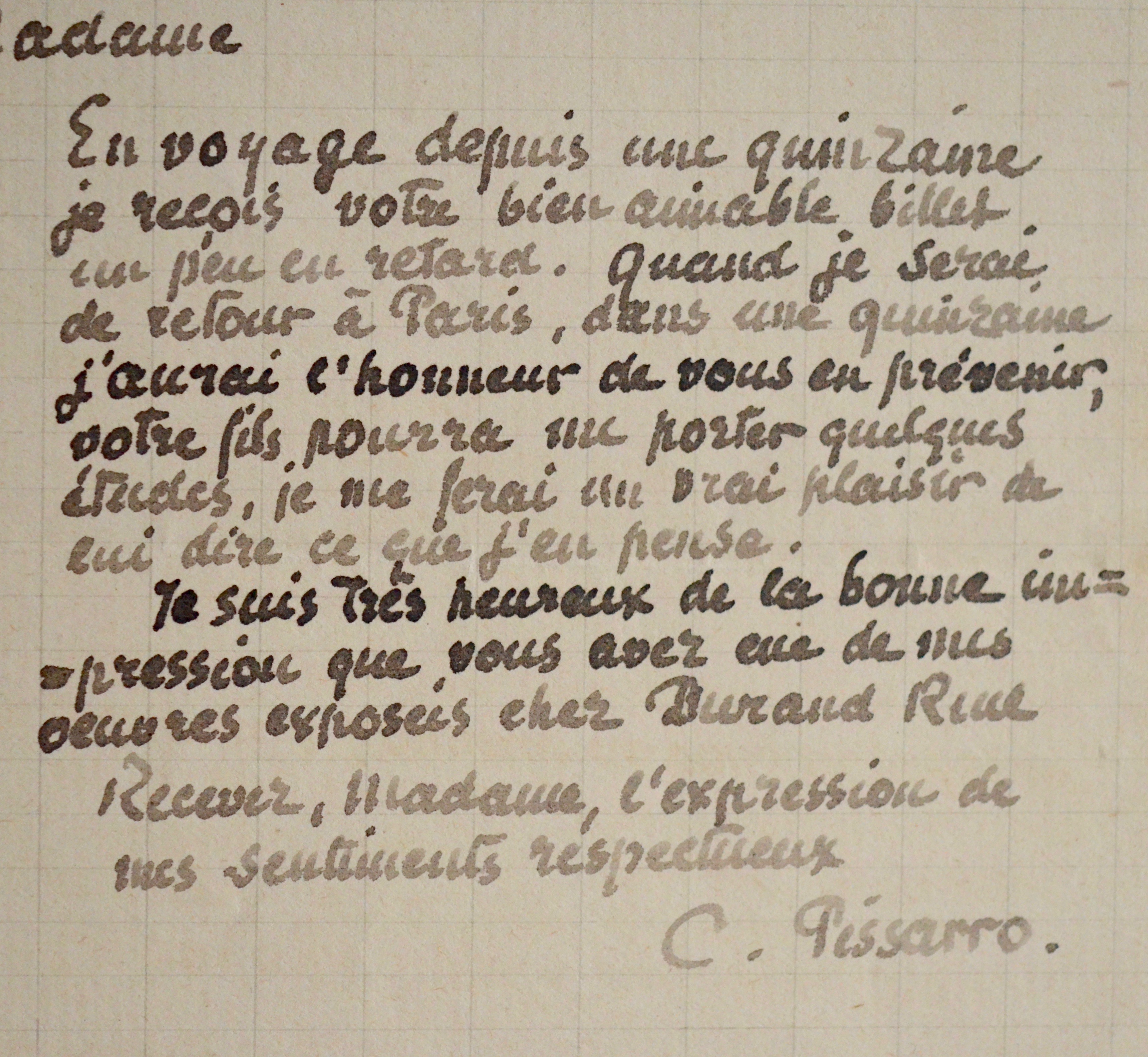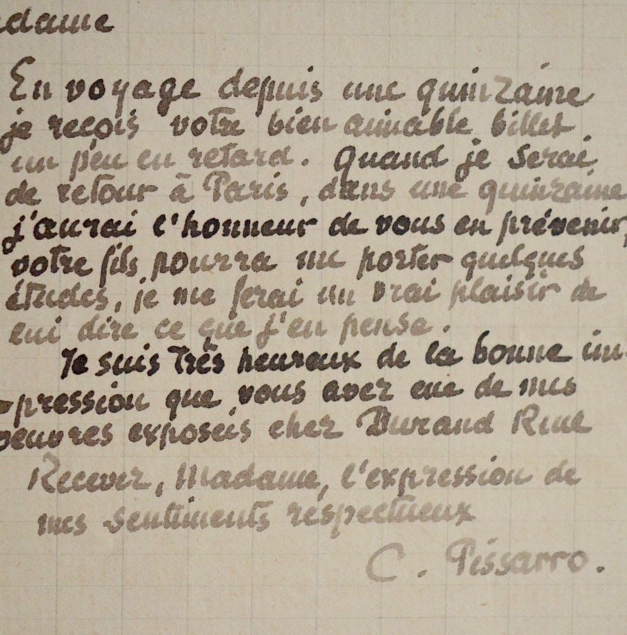 Camille Pissarro, lorsqu'il rentrera à Paris, sera heureux de donner son avis quant aux dessins du fils de sa correspondante. "Votre fils pourra me porter quelques études, je me ferai un vrai plaisir de lui dire ce que j'en pense [...]". Il se réjouit de l'enthousiasme suscité par ses tableaux : "Je suis très heureux de la bonne impression que vous avez eue de mes oeuvres exposées chez Durand-Ruel".