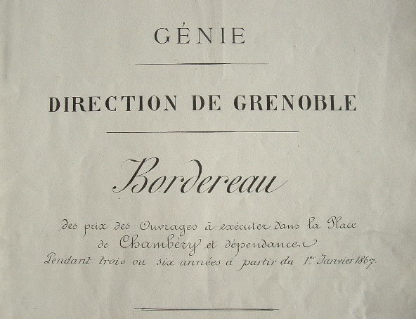 Détail chiffré des 750 postes de dépense pour la tranche de travaux prévus à Chambéry : "Bordereau des prix des ouvrages à exécuter dans la place de Chambéry et dépendances pendant trois ou six années à partir du 1er janvier 1867".