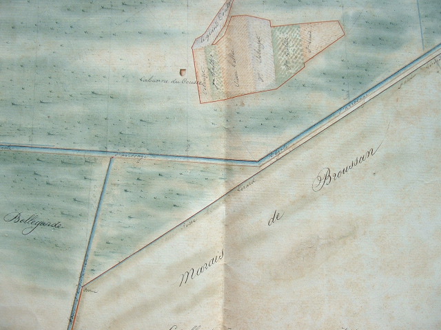 Plan manuscrit aquarellé du marais de Broussan (Gard).