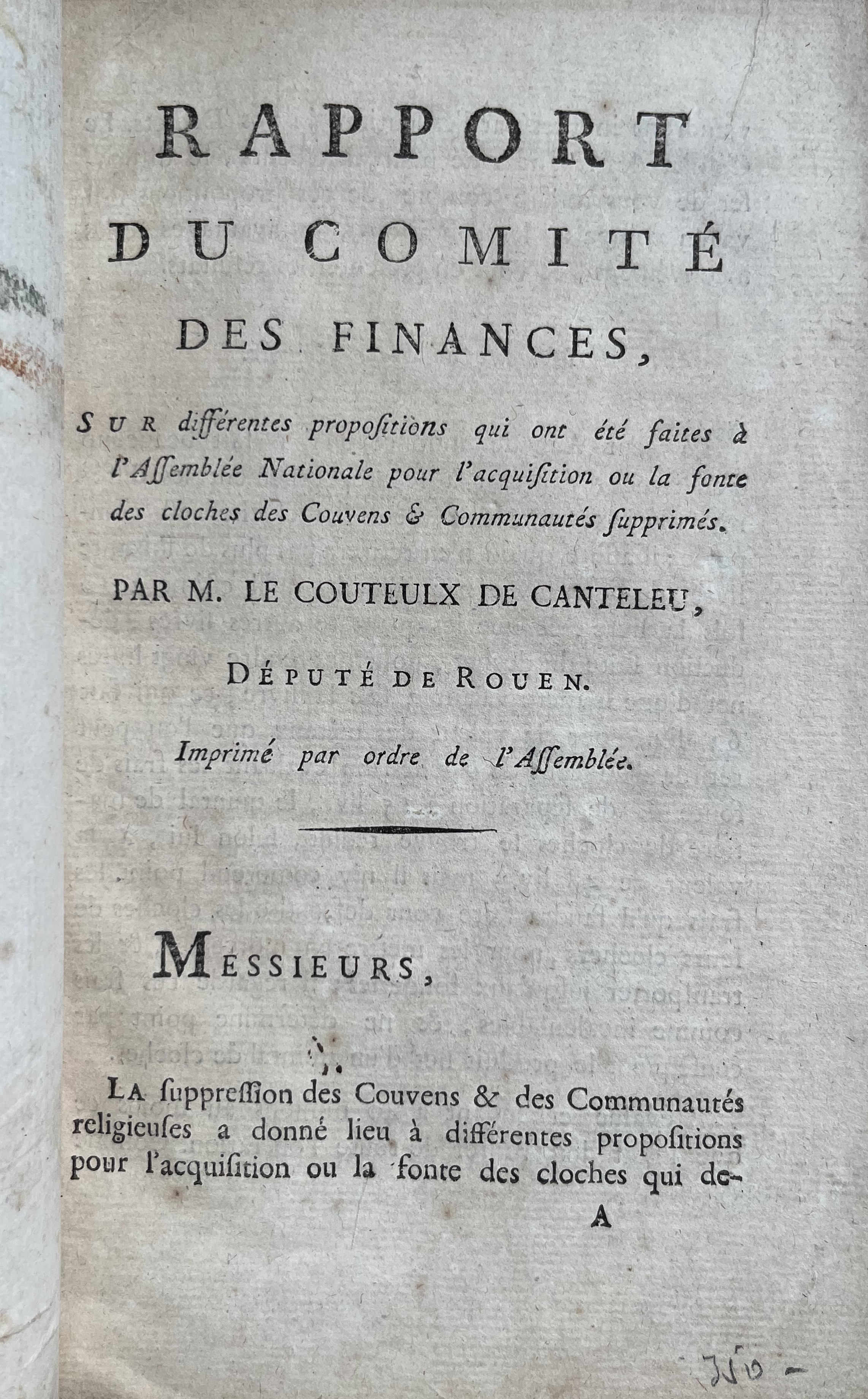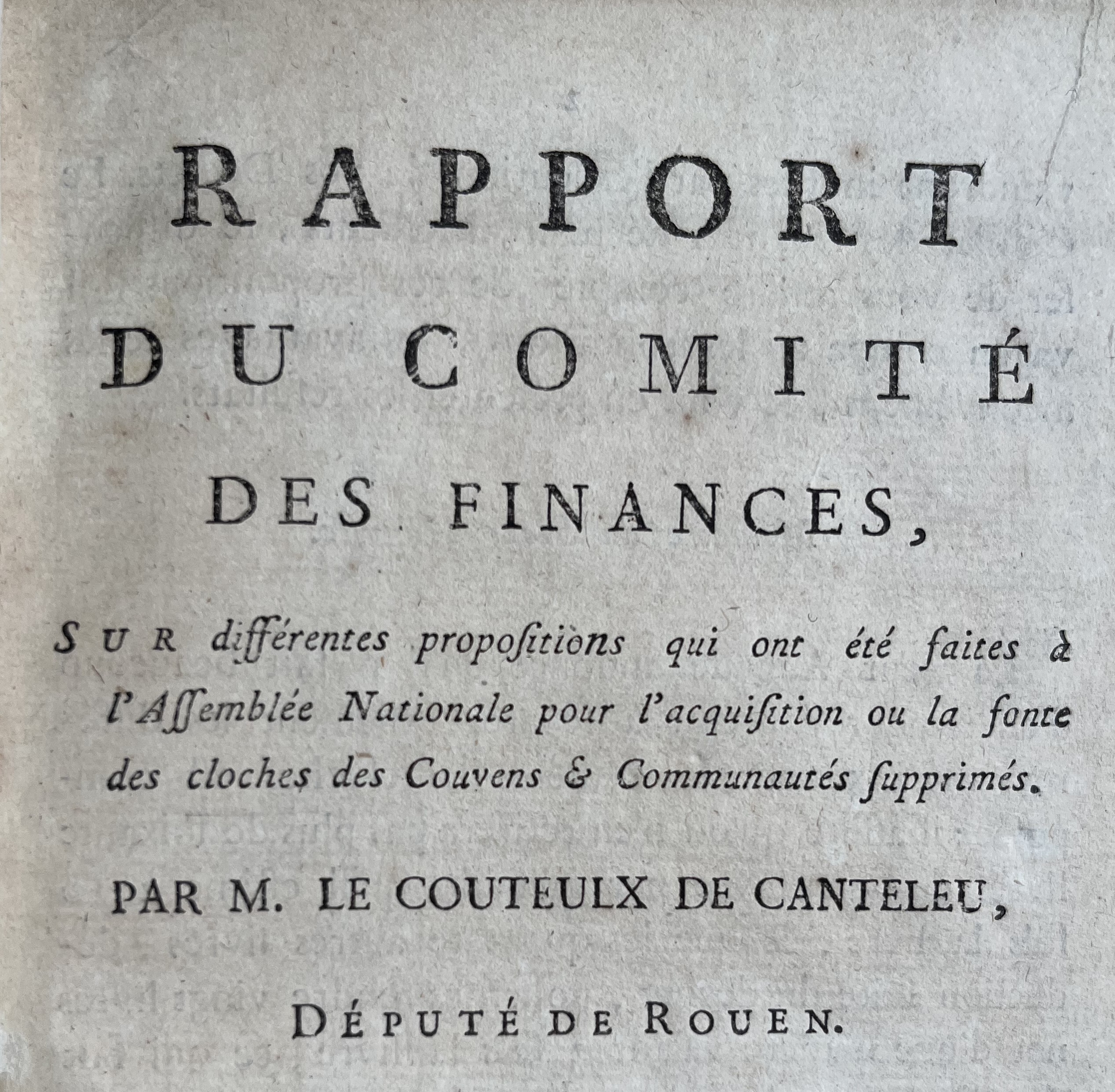 Plaquette imprimée d'un discours du député de Rouen, Le Couteulx de Canteleu, intitulé : "Rapport du Comité des finances, sur différentes propositions qui ont été faites à l'Assemblée Nationale pour l'acquisition ou la fonte des cloches des Couvens et Communautés supprimés".