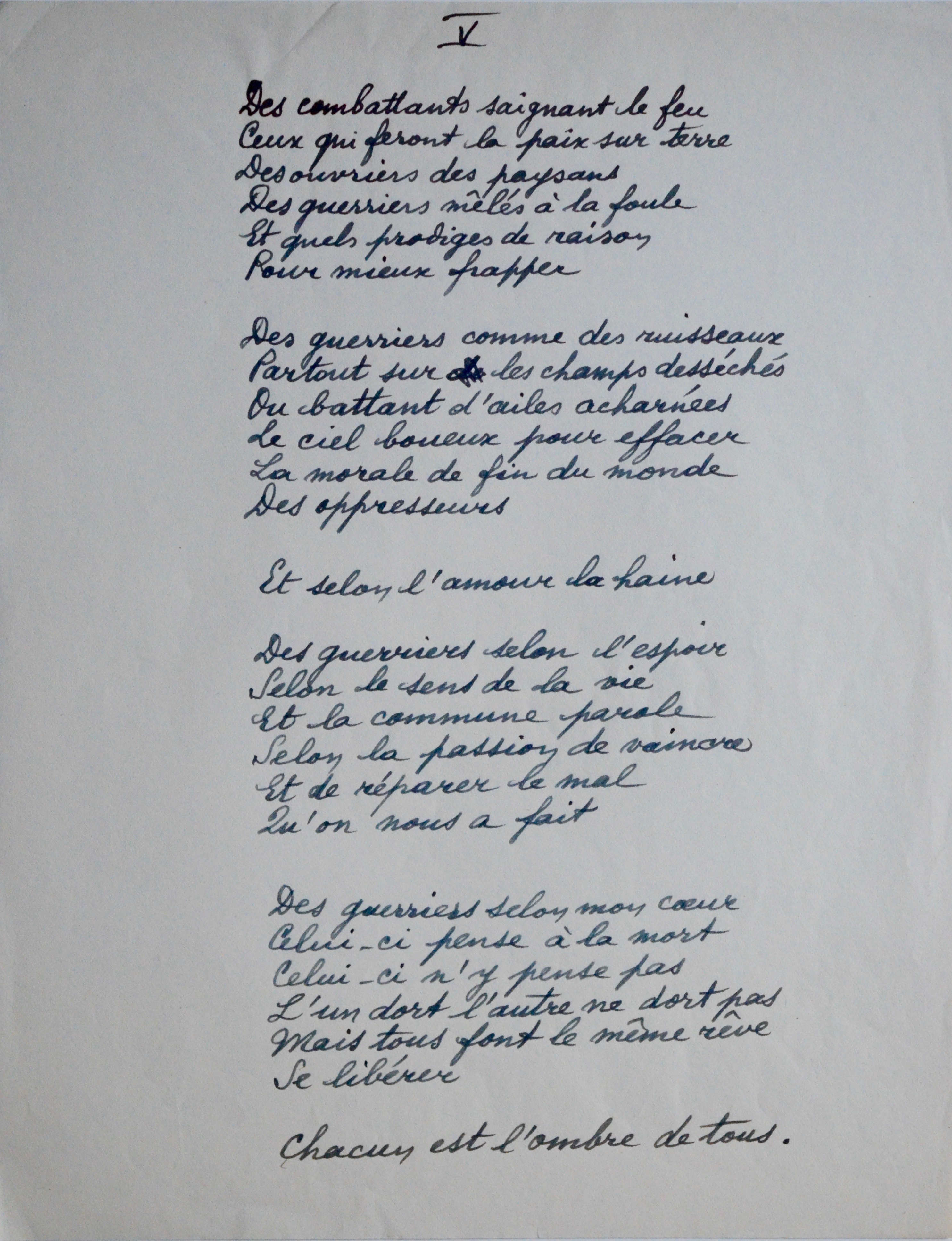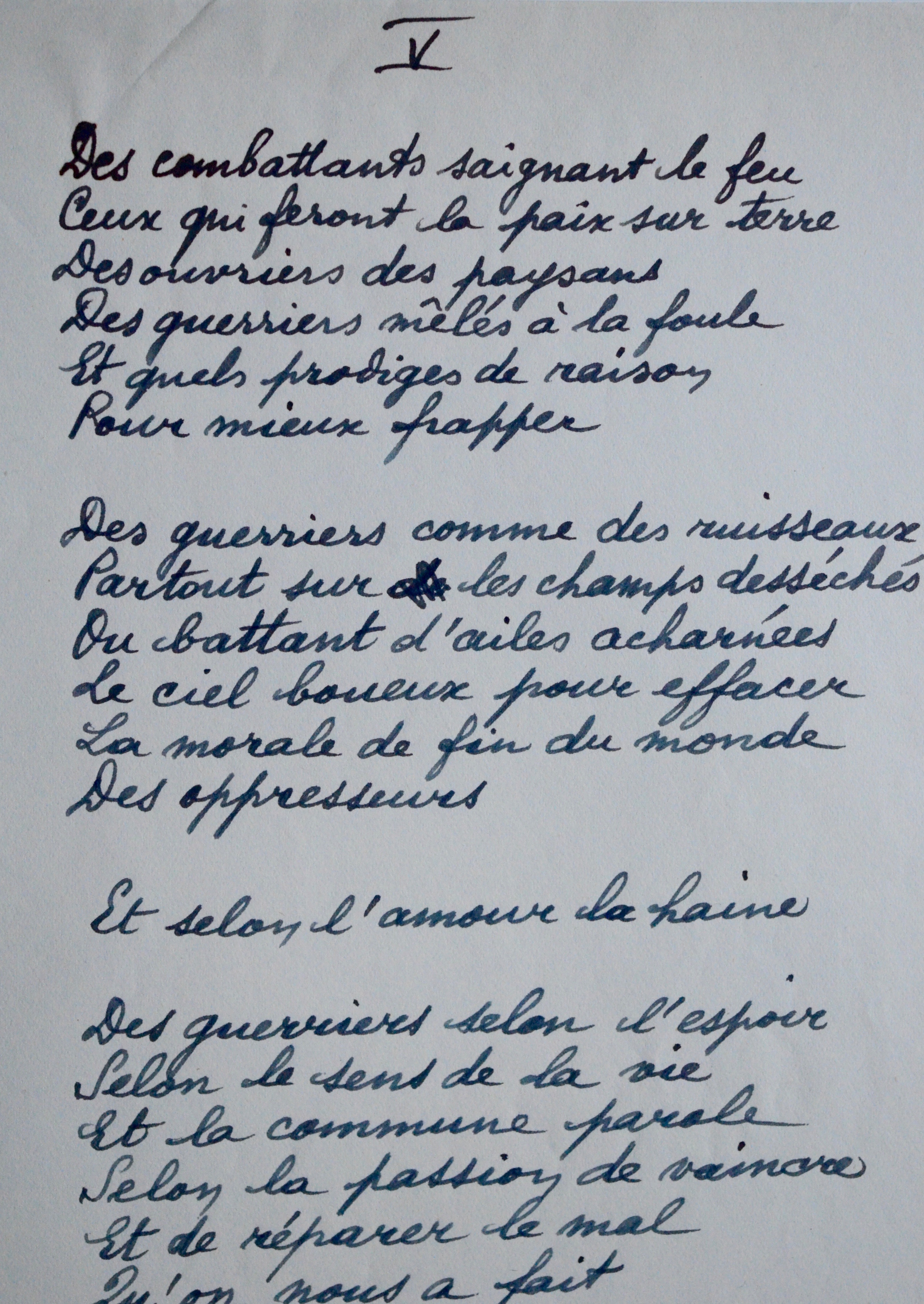 Paul Éluard (Saint-Denis, 1895/1952)Poème autographe de Paul Éluard, superbement calligraphié, formant le Ve poème du recueil Les Armes de la douleur, publié en 1944.