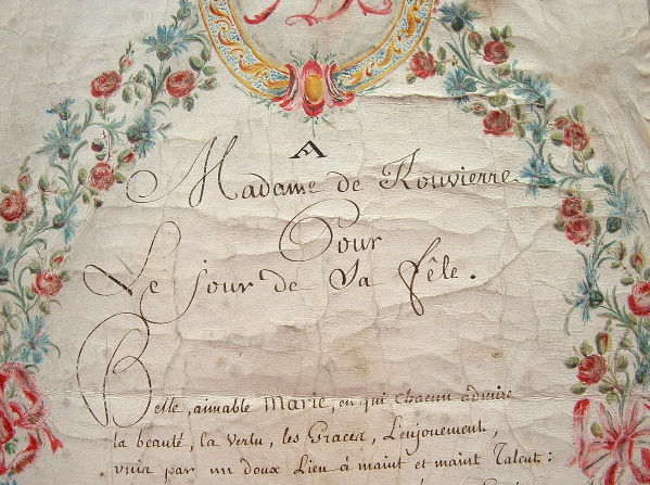 Poème écrit à l'attention de Mme de Rouvierre, pour le jour de sa fête, dans un très joli cartouche peint à la main, de rinceaux fleuris, de rubans et d'oiseaux.