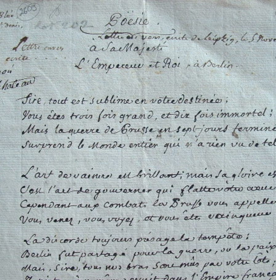 "Poésie à Sa Majesté l'Empereur et Roi, à Berlin". Après la victoire d'Iéna (14 octobre 1806), Napoléon fait son entrée à Berlin (2 novembre). François de Neufchâteau écrit ce long poème (100 vers) à sa gloire [comme président du Sénat, il s'était précipité à Berlin pour complimenter l'Empereur et rapporter les trophées pris à l'ennemi]. «Sire, tout est sublime en votre destinée ; Vous êtes trois fois grand, et dix fois immortel ; Mais la guerre de Prusse en sept jours terminée, Surprend le monde entier qui n'a rien vu de tel [...]».