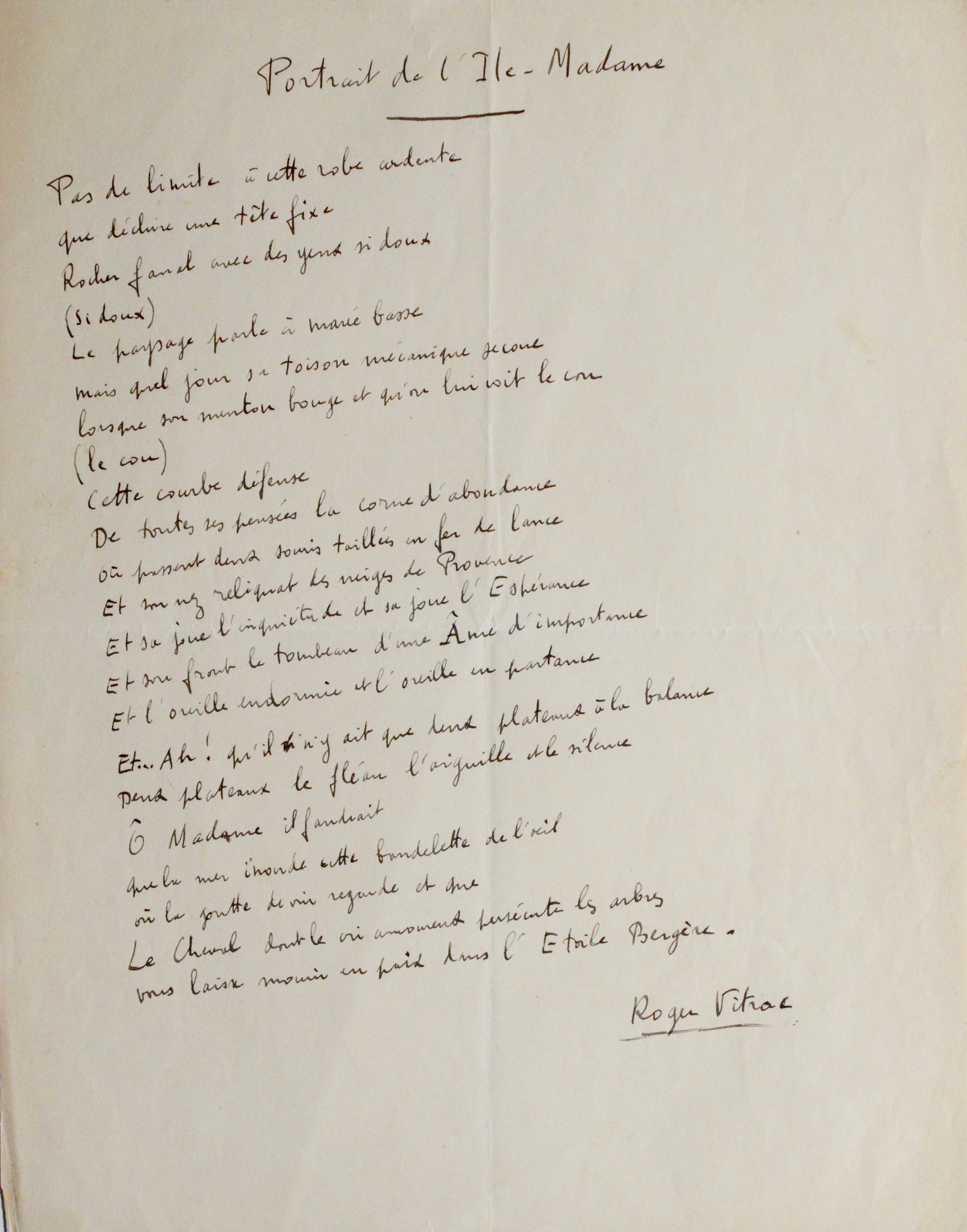 Poème de Roger Vitrac, intitulé « Portrait de l’Ile-Madame »
