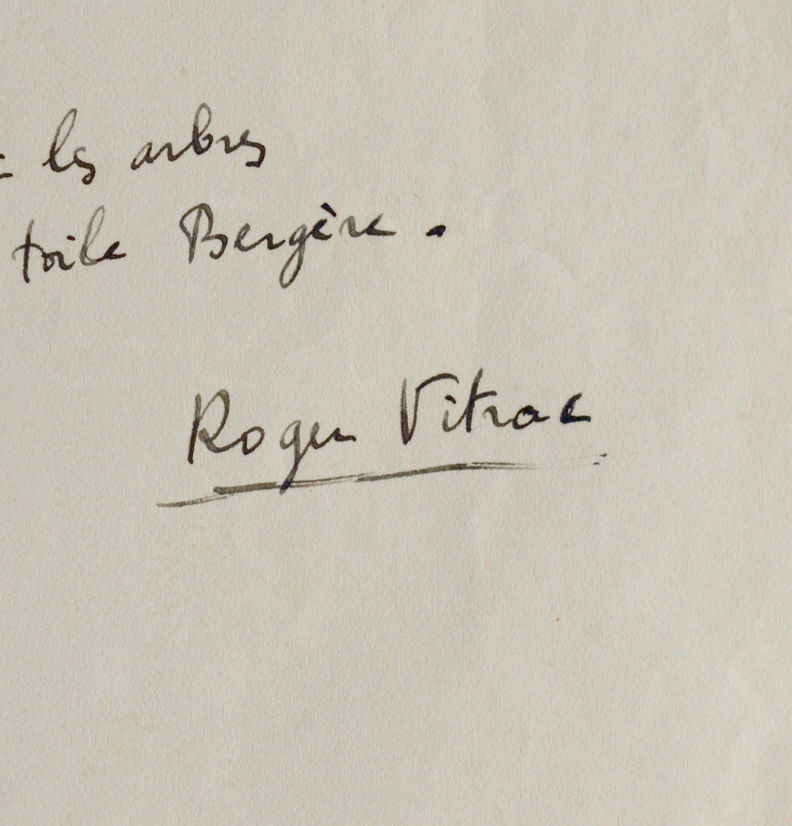 Poème autographe signé de Roger Vitrac, de 22 lignes, intitulé "Portrait de l’Ile-Madame". Il fut envoyé à André Rolland de Renéville, par l'auteur, pour la revue "Le Rouge et le Noir".
