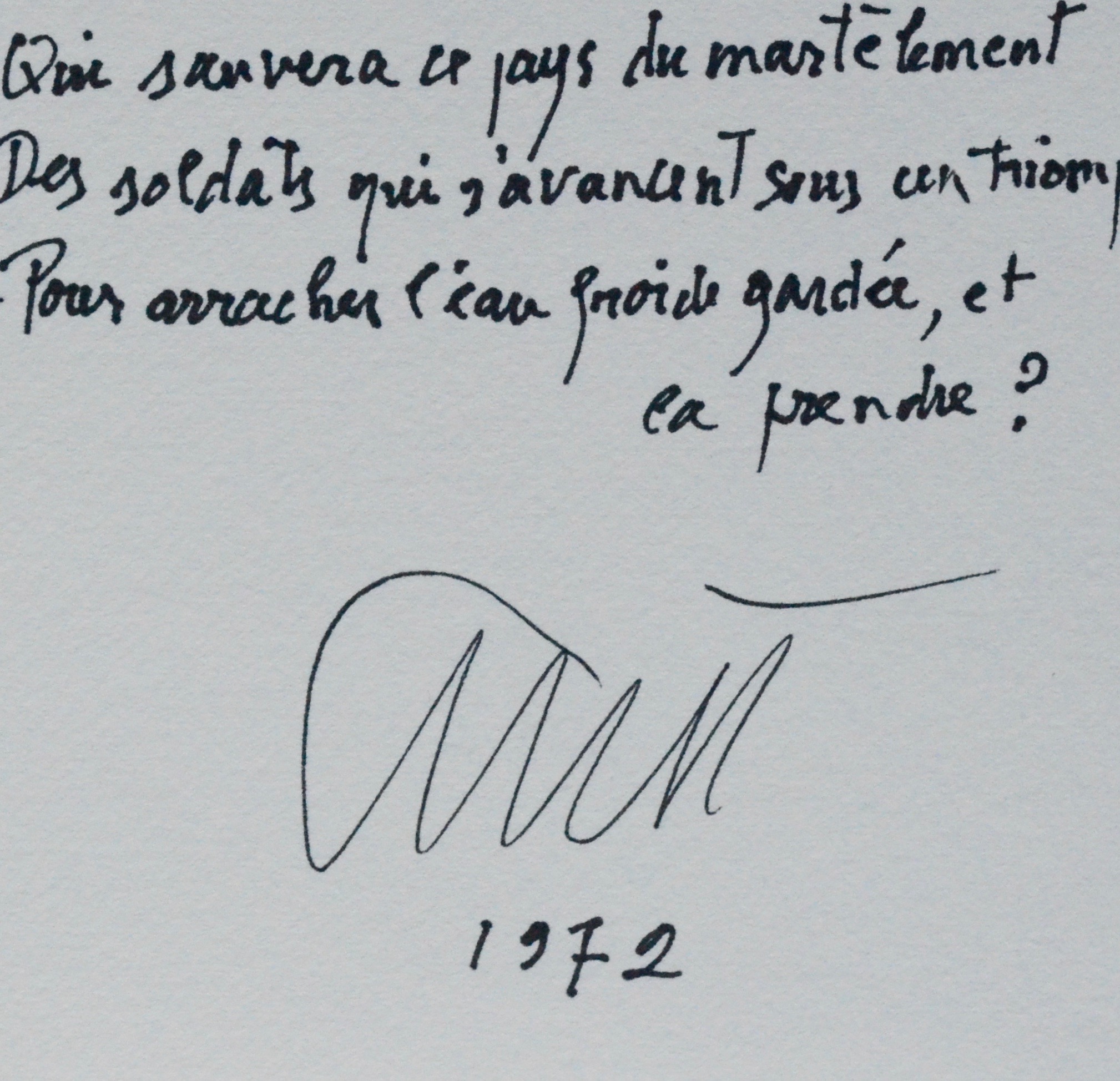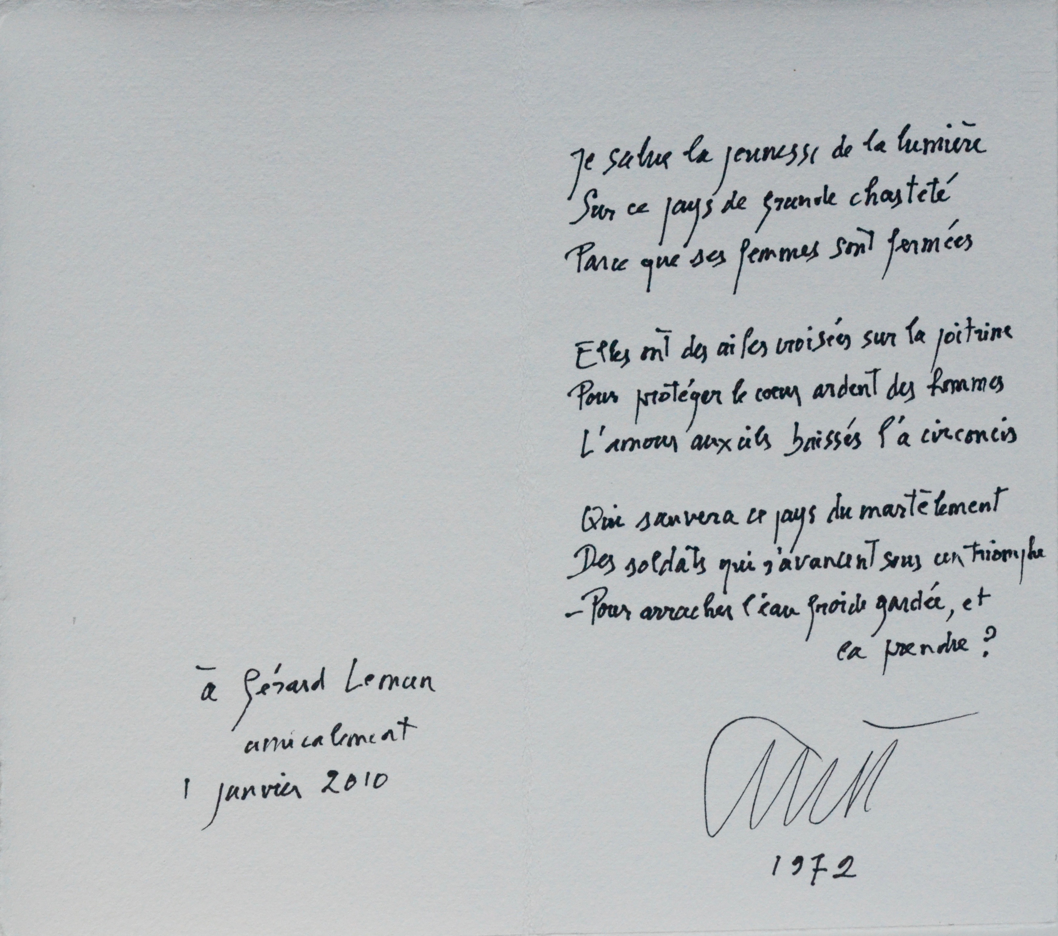 Poème autographe de Salah Stétié, extrait de "L'eau froide gardée" (1972), avec envoi à Gérard Leman :