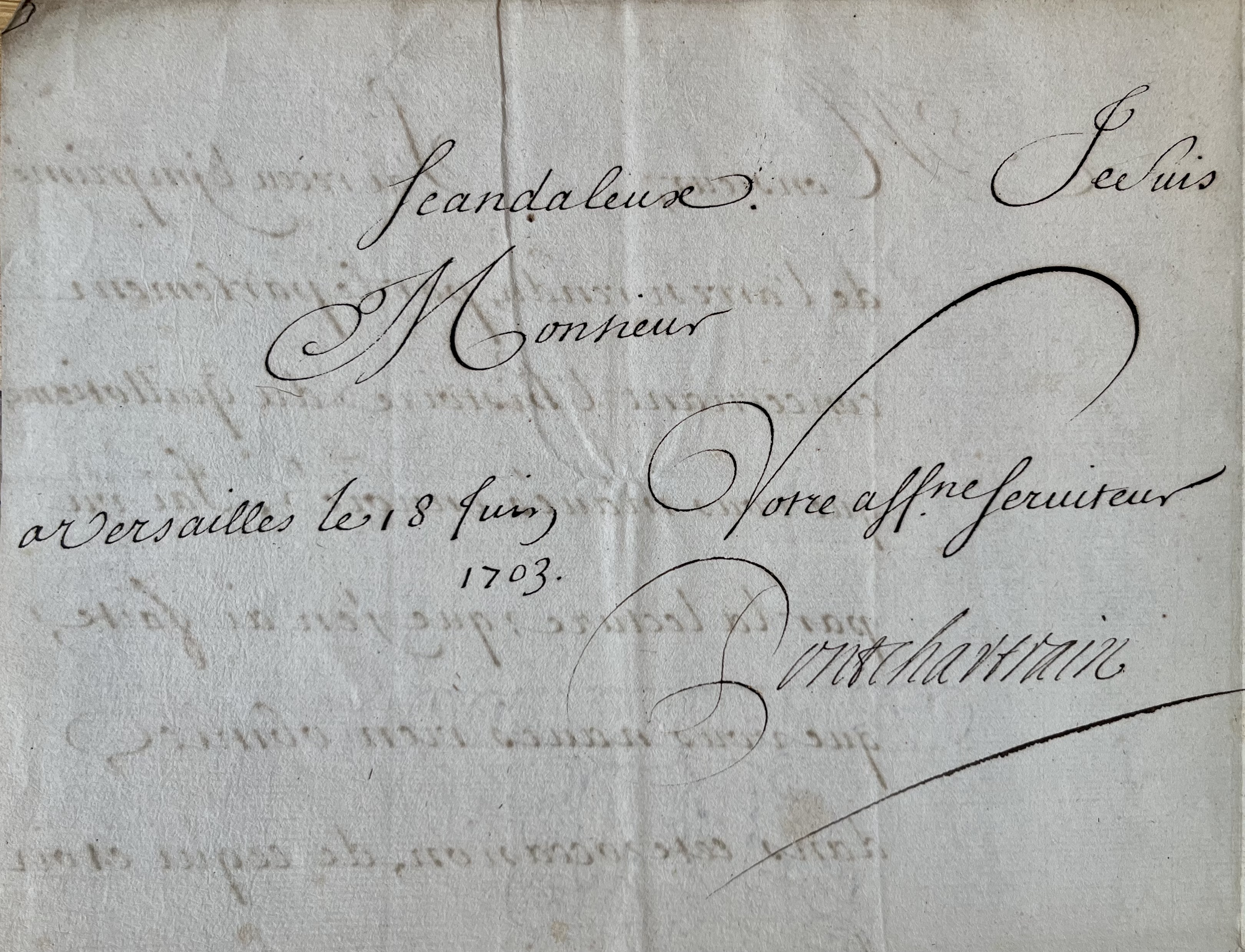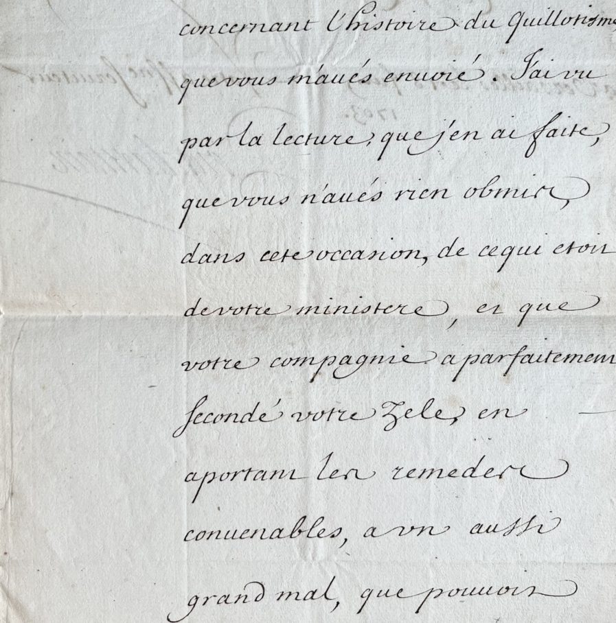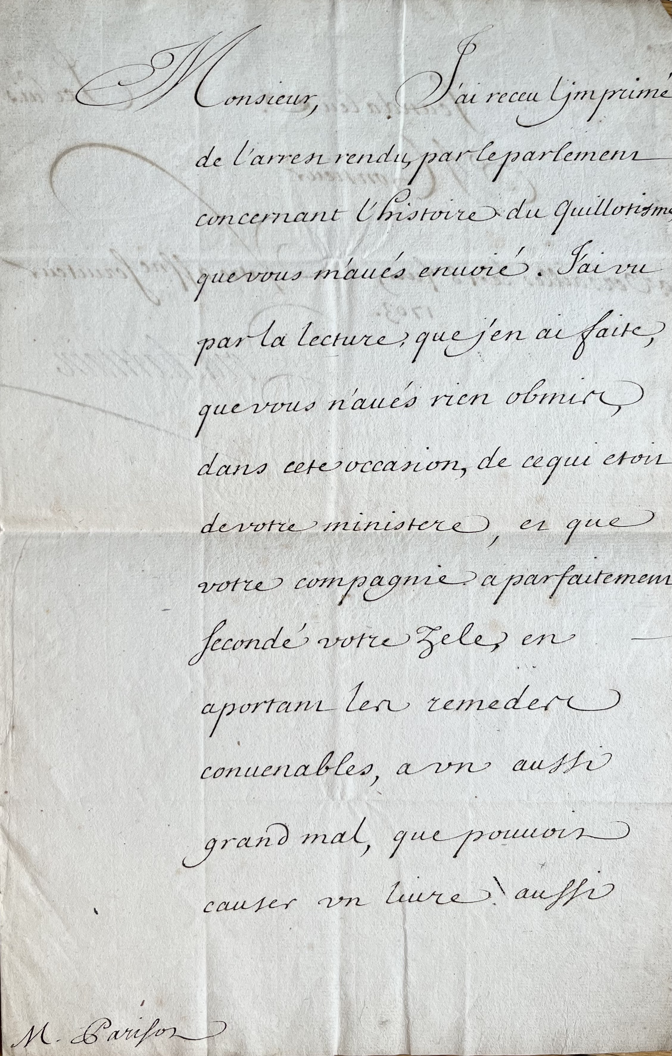 Louis Phélypeaux de Pontchartrain (Paris, 1643/1727)Louis Phélypeaux, comte de Pontchartrain, alors chancelier de France, accuse réception de l'arrêt de censure, rendu "par le parlement concernant l'Histoire du Quillotisme" et félicite chaudement son auteur, Parisot. "J'ai vu par la lecture que j'en ai faite que vous n'avés rien obmis dans cette occasion, de ce qui étoit de votre ministère et que votre compagnie a parfaitement secondé votre zèle, en apportant les remèdes convenables, à un aussi grand mal, que pouvoit causer un livre aussi scandaleux".
