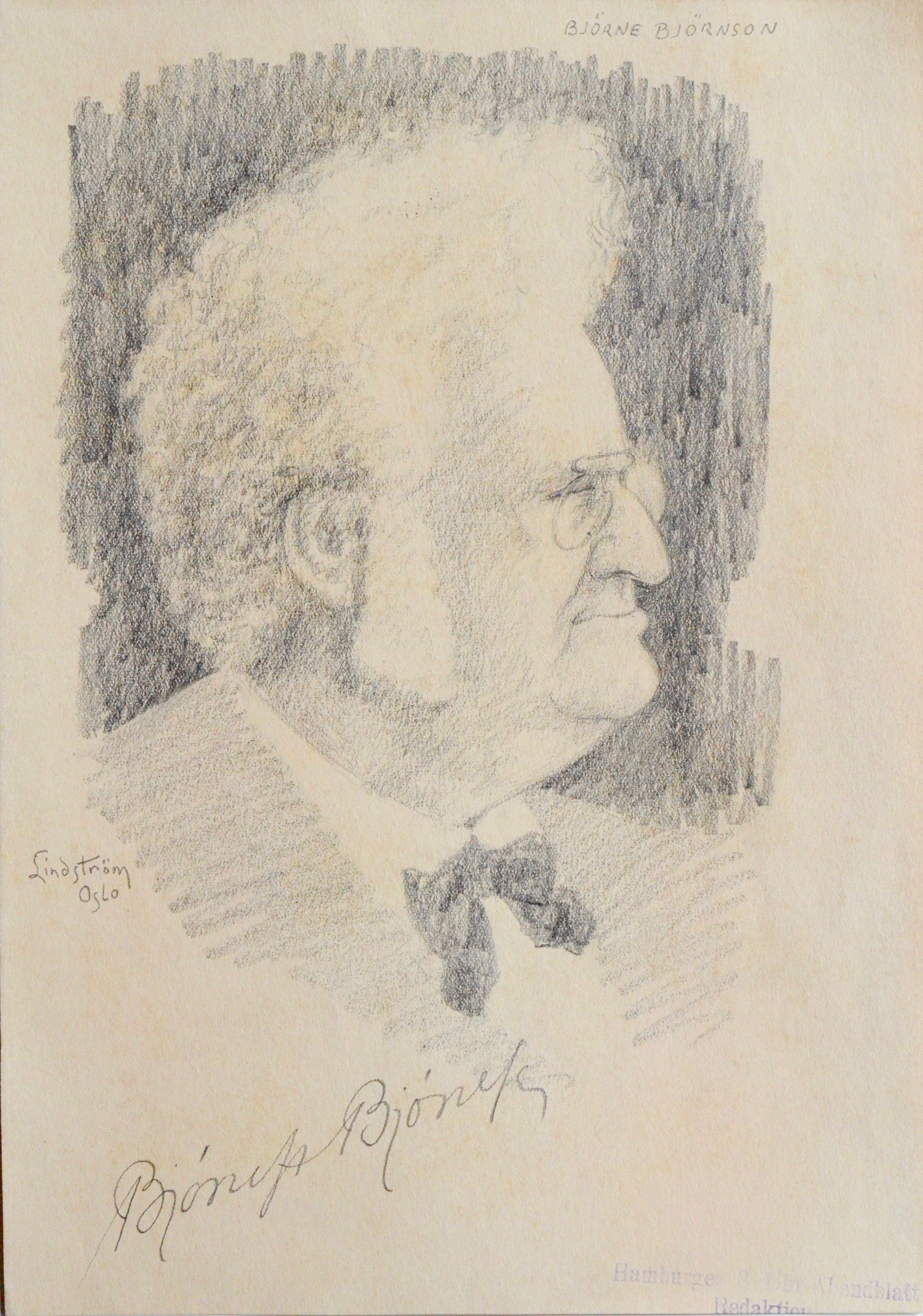 Portrait à la mine de plomb du dramaturge et Nobel norvégien Bjørnson, de profil, avec sa signature autographe en pied.
