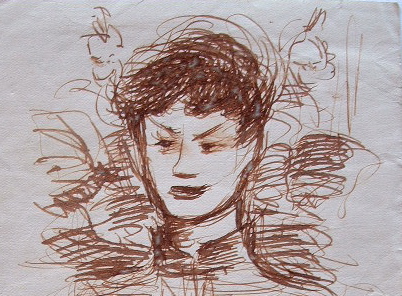 Portrait à la plume de l'actrice Simone Simon, par Dimitri Berea (encre brune au dos au dos d'une carte "Collection automne-hiver 1947"). Dédicacé : «à Simone Simon de la part de Berea. Paris 1947».