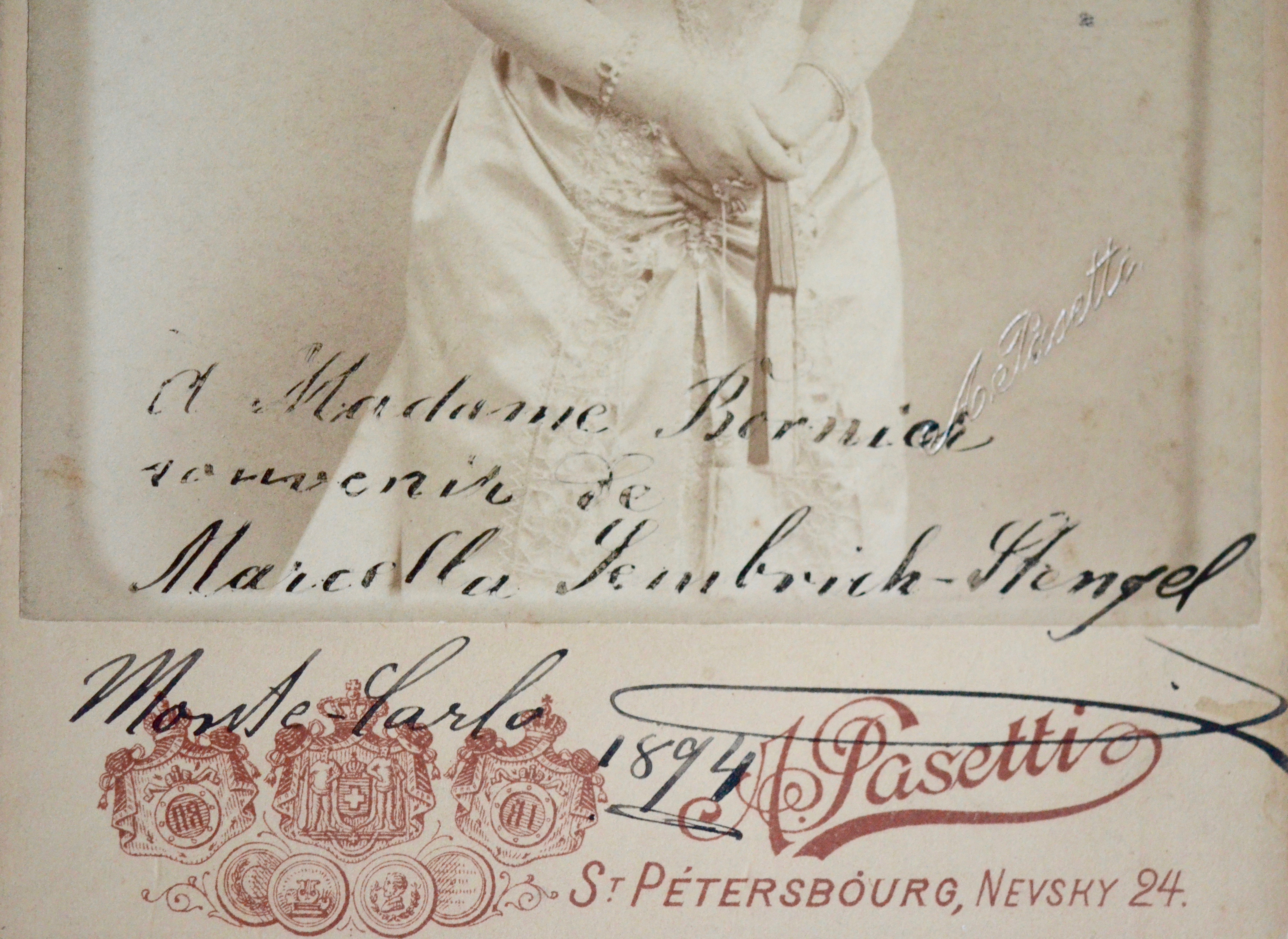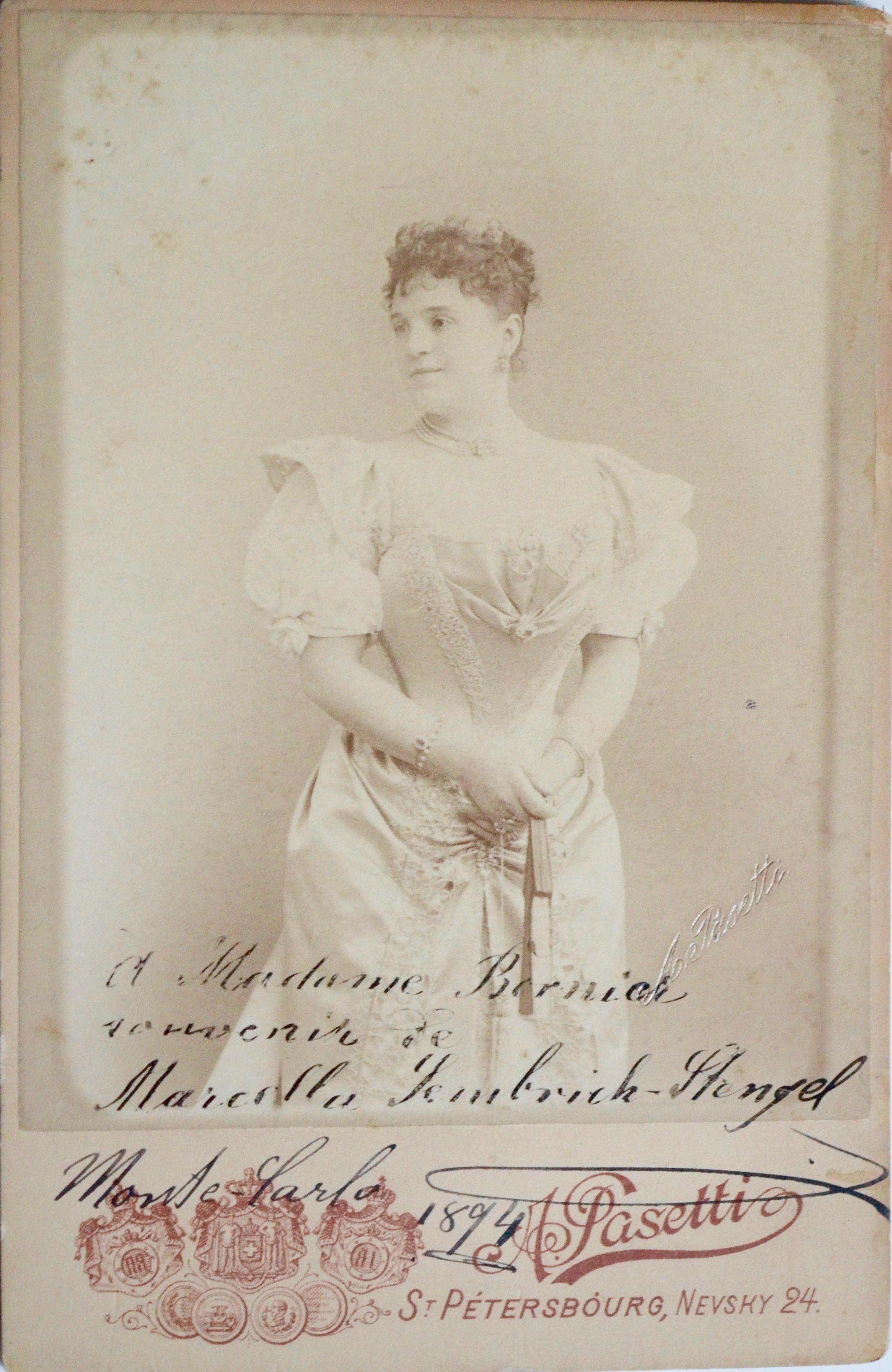 Envoi autographe signé en bas du cliché et sur le cartonnage « À Madame Bernier souvenir de Marcella Sembrich-Stengel», à la date de 1894.