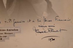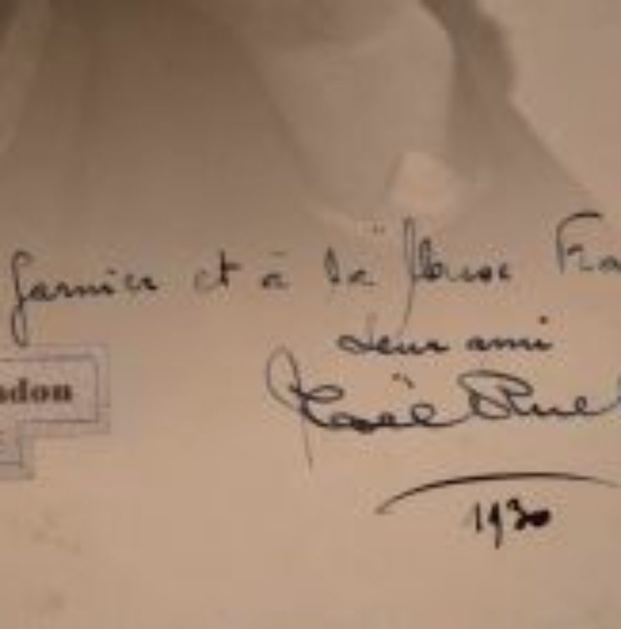 Portrait photographique du poète et collectionneur Noël Ruet (cliché Mertens-Auradon), dédicacé sur la photo, avec un quatrain autographe sur le montage : «Que me réserves-tu, printemps? L'air est léger / Et le soleil timide à la branche sans feuille / Ne m'offre pas la fleur d'un espoir mensonger : / Le plus beau rêve est cendre au moment qu'on le cueille».