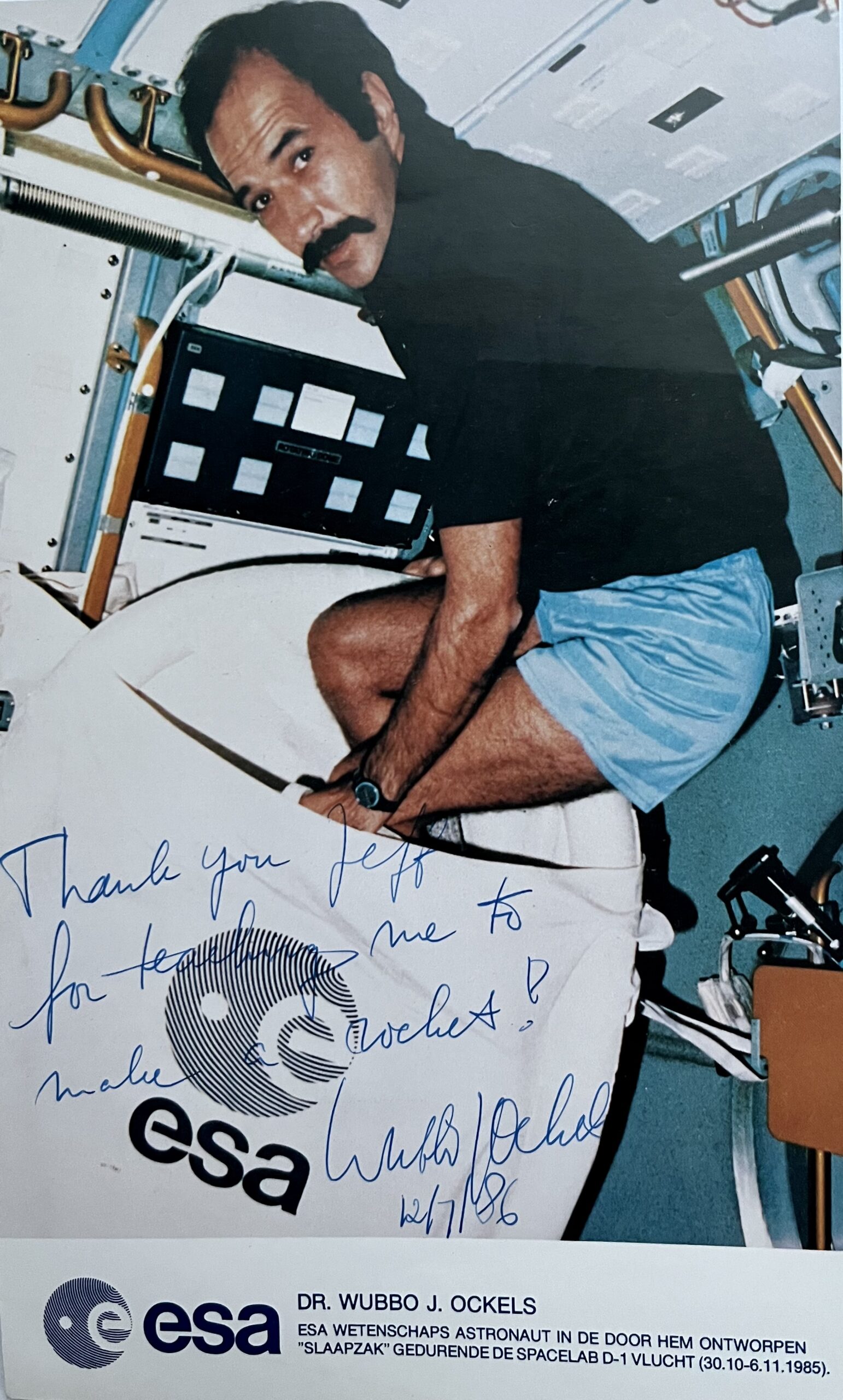 Photographie (reproduction faite par l'ESA) du spationaute néerlandais Wubbo J. Ockels dans le spacelab D-1 de l'European Space Agency, avec légende imprimé en pied du document. Il fit un unique vol à bord de Challenger (vol STS 61-A) comme spécialiste de la charge utile.