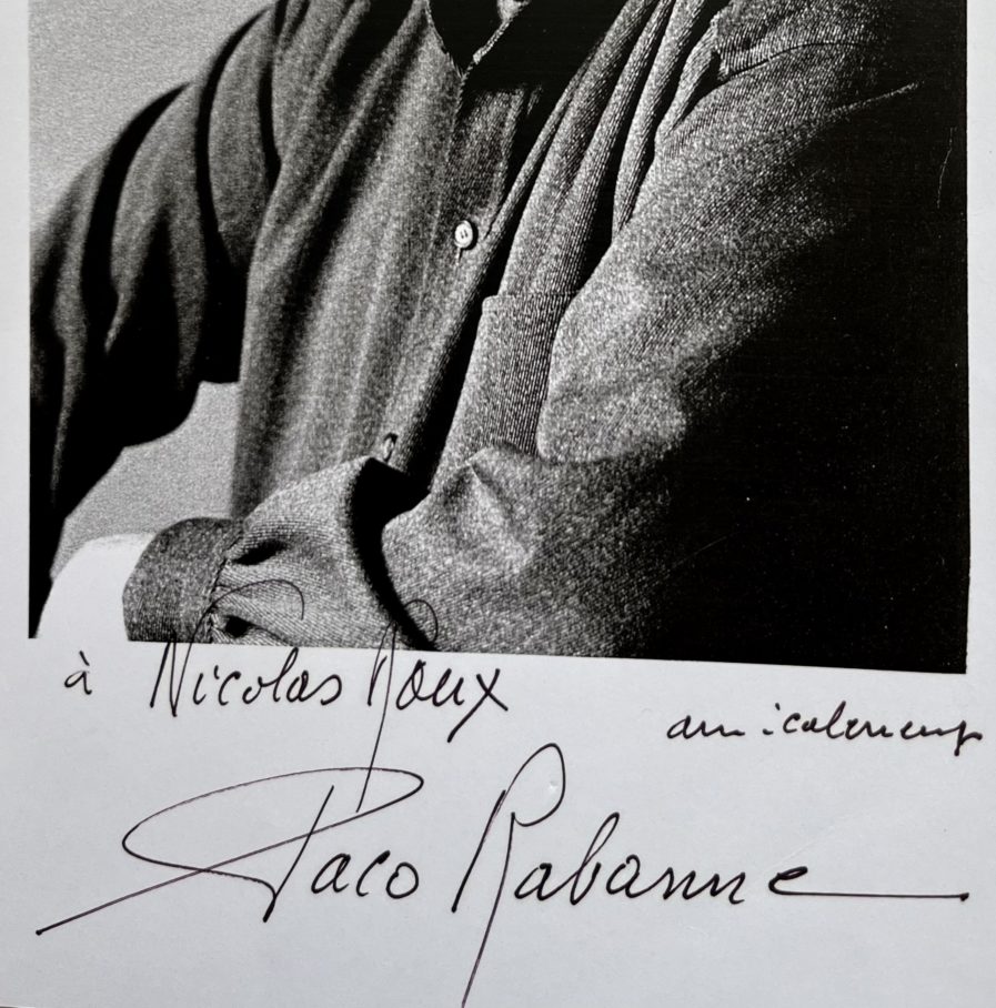 Dédicacé dans la marge blanche, au stylo à bille noir "A Nicolas Roux amicalement. Paco Rabanne".