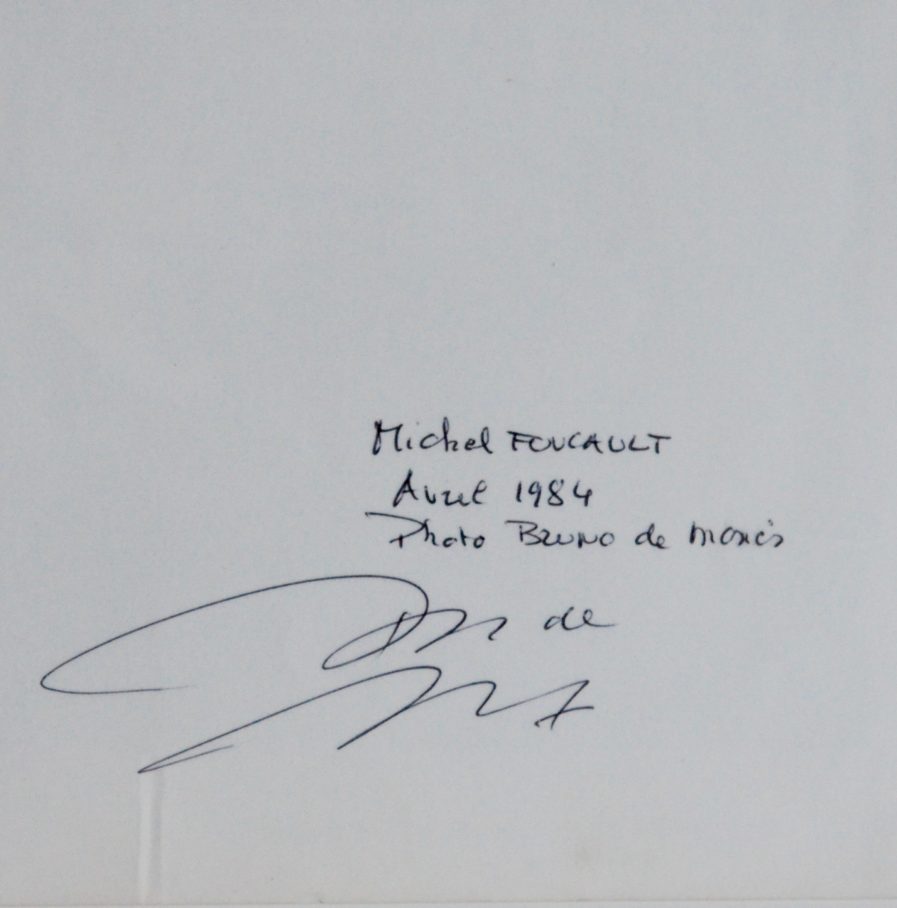 Signature de Bruno de Monès (né en 1952), photographe spécialiste des portraits d'artistes et d'intellectuels, au stylo à bille noir, au verso. Et dans la marge inférieure, mention de copyright + nom et date.