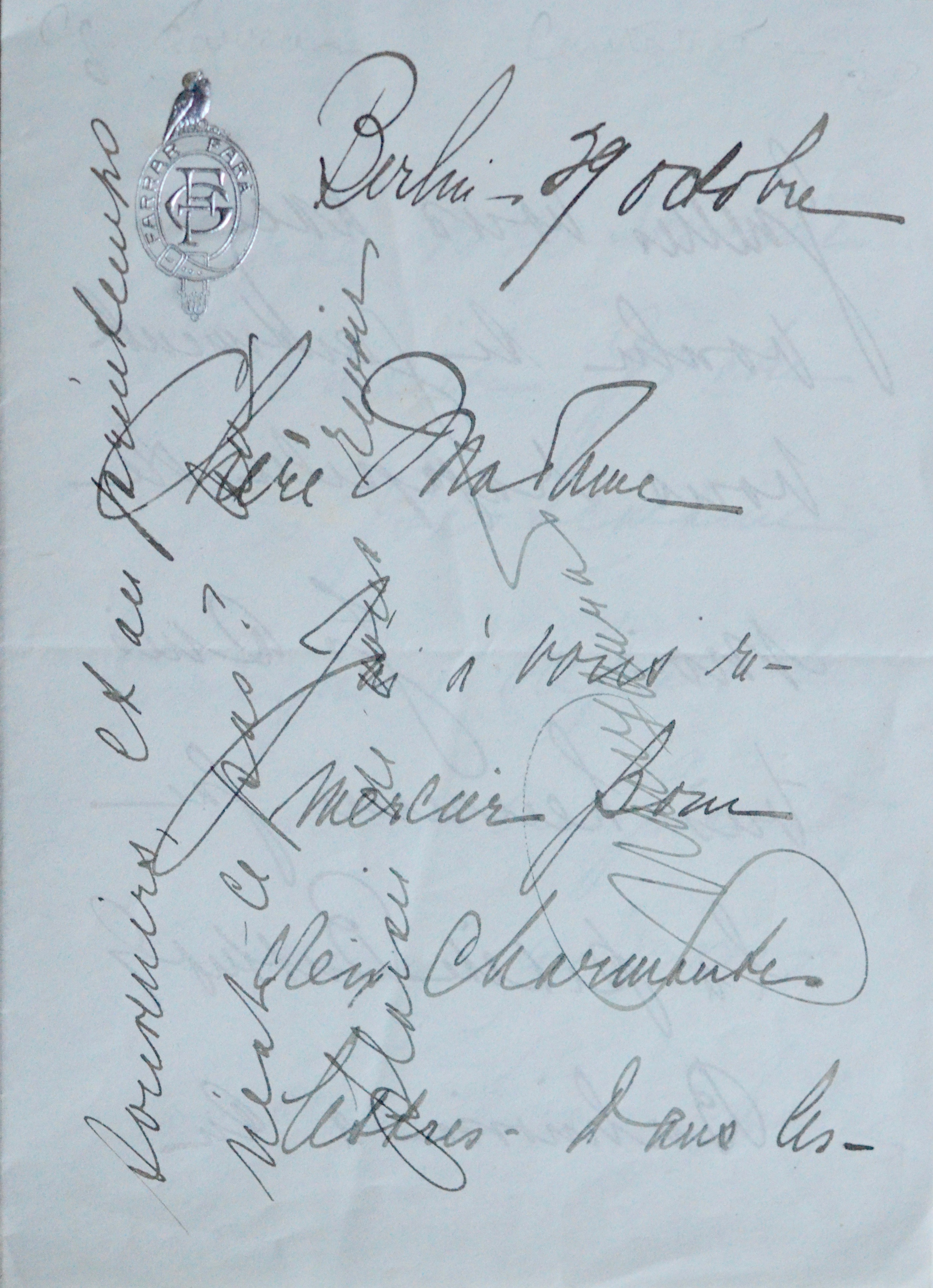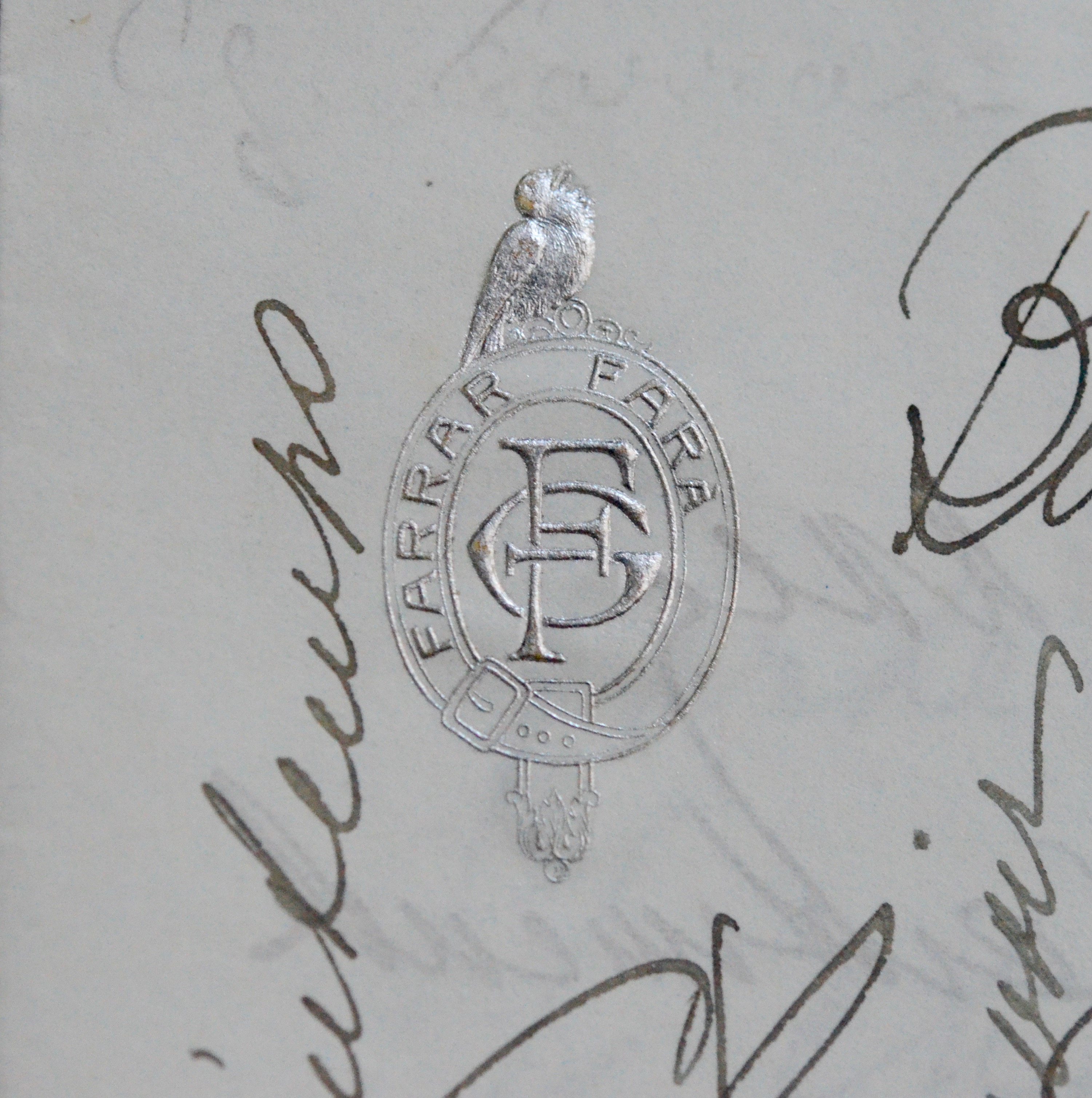Encre noire sur double feuillet. Beau chiffre de la cantatrice gaufré en tête du premier feuillet surmonté d’un oiseau au palladium.