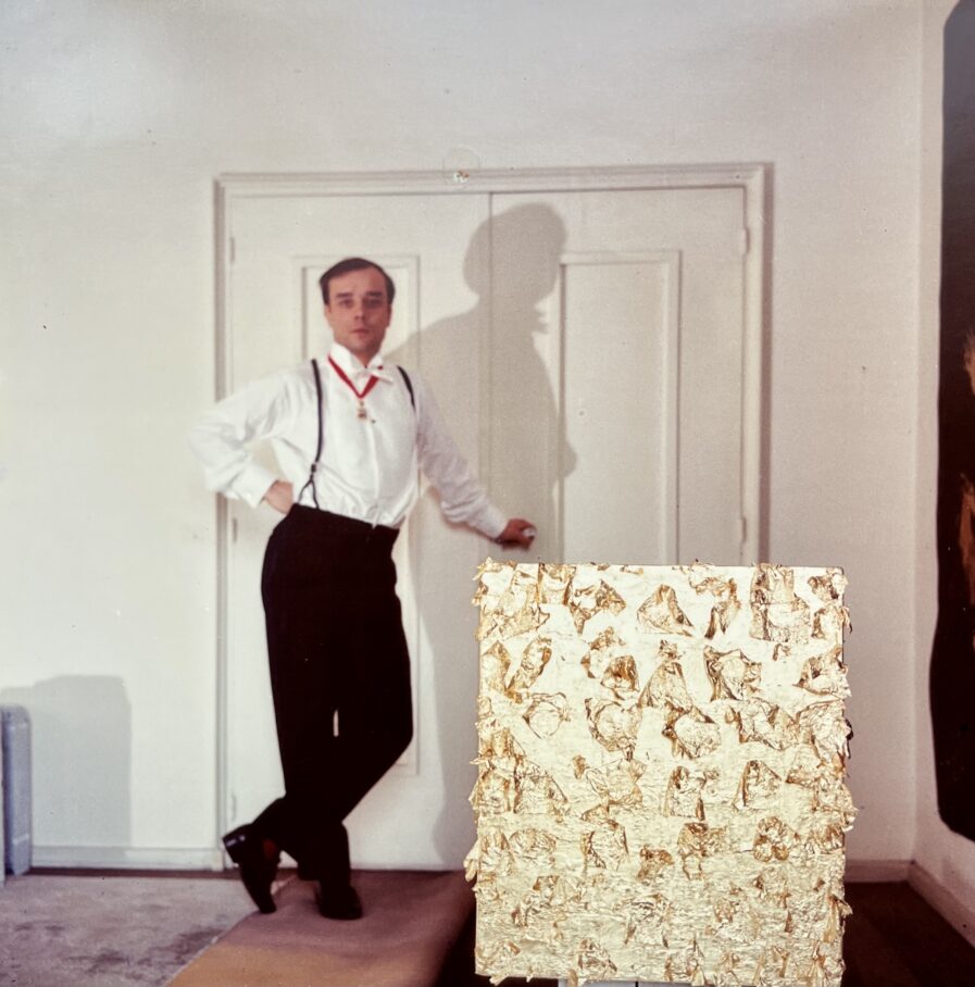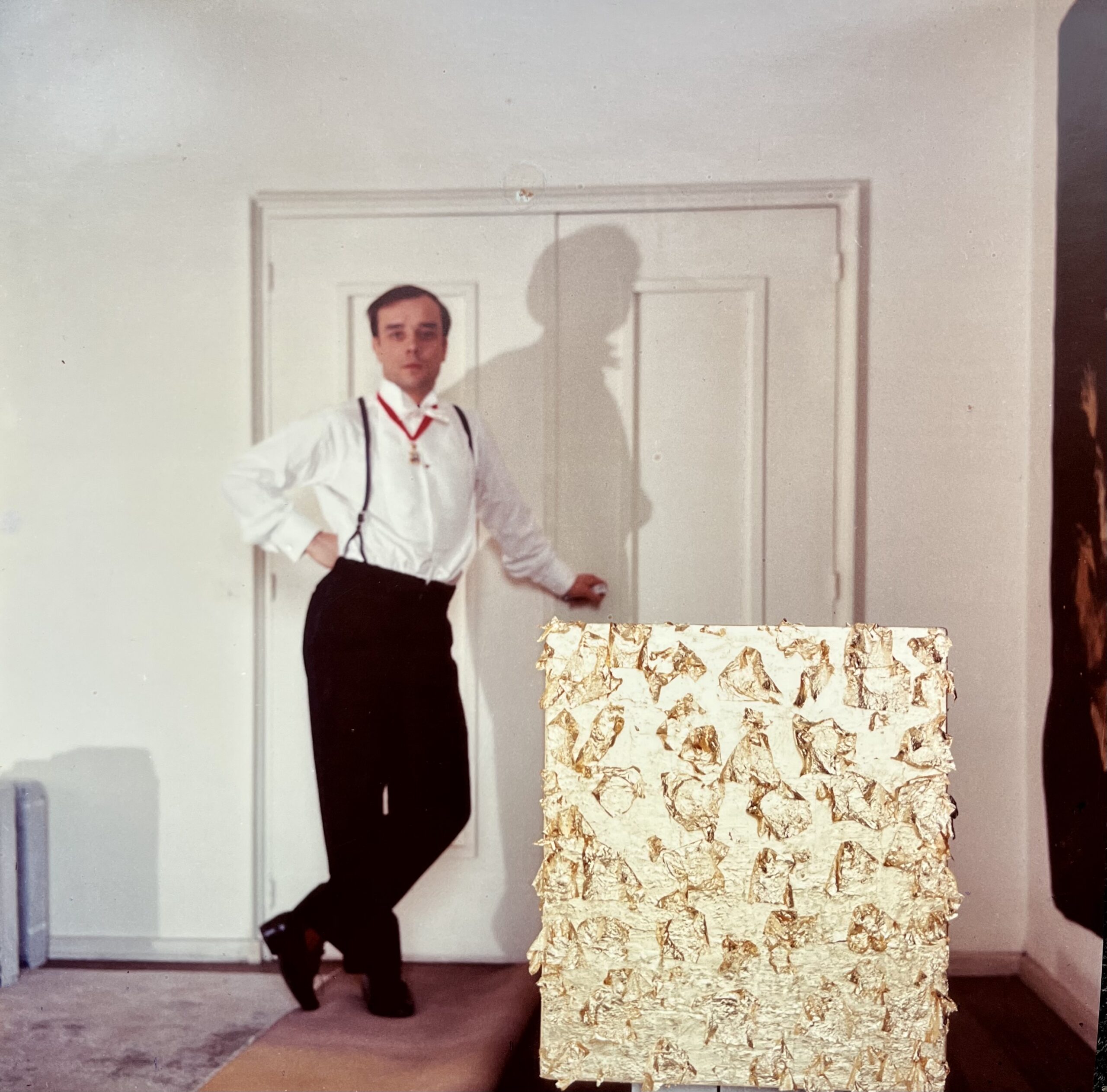 L'artiste Yves Klein pose à côté de sa sculpture Monogold MG15. Portrait réalisé par les photographes Harry Shunk et Janos Kender. Ils immortalisèrent l’avant-garde artistique parisienne et américaine, directement dans l’intimité des ateliers d'artiste.