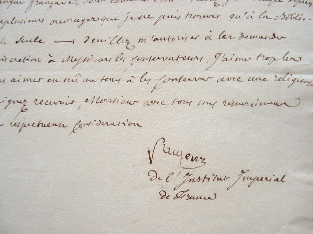Charles Pougens (Paris, 1755/1833)Pougens sollicite les services de Dacier, conservateur à la Bibliothèque impériale. «J'ai souvent besoin pour mon Trésor des origines de la langue française, dont comme vous le savez, je m'occupe depuis trente six ans, de plusieurs ouvrages que je ne puis trouver qu'à la Bibliothèque impériale seule». Il demande l'autorisation de les emprunter. «J'aime trop les livres pour ne pas aimer en même temps à les conserver avec une religieuse exactitude [...]». [Il avait commencé la rédaction de son Trésor des origines et Dictionnaire grammatical raisonné de la langue française en 1776, lors d'une mission à Rome ; de ce travail auquel il consacra une grande partie de sa vie sans pouvoir l'achever, seul un prospectus parut en 1819].