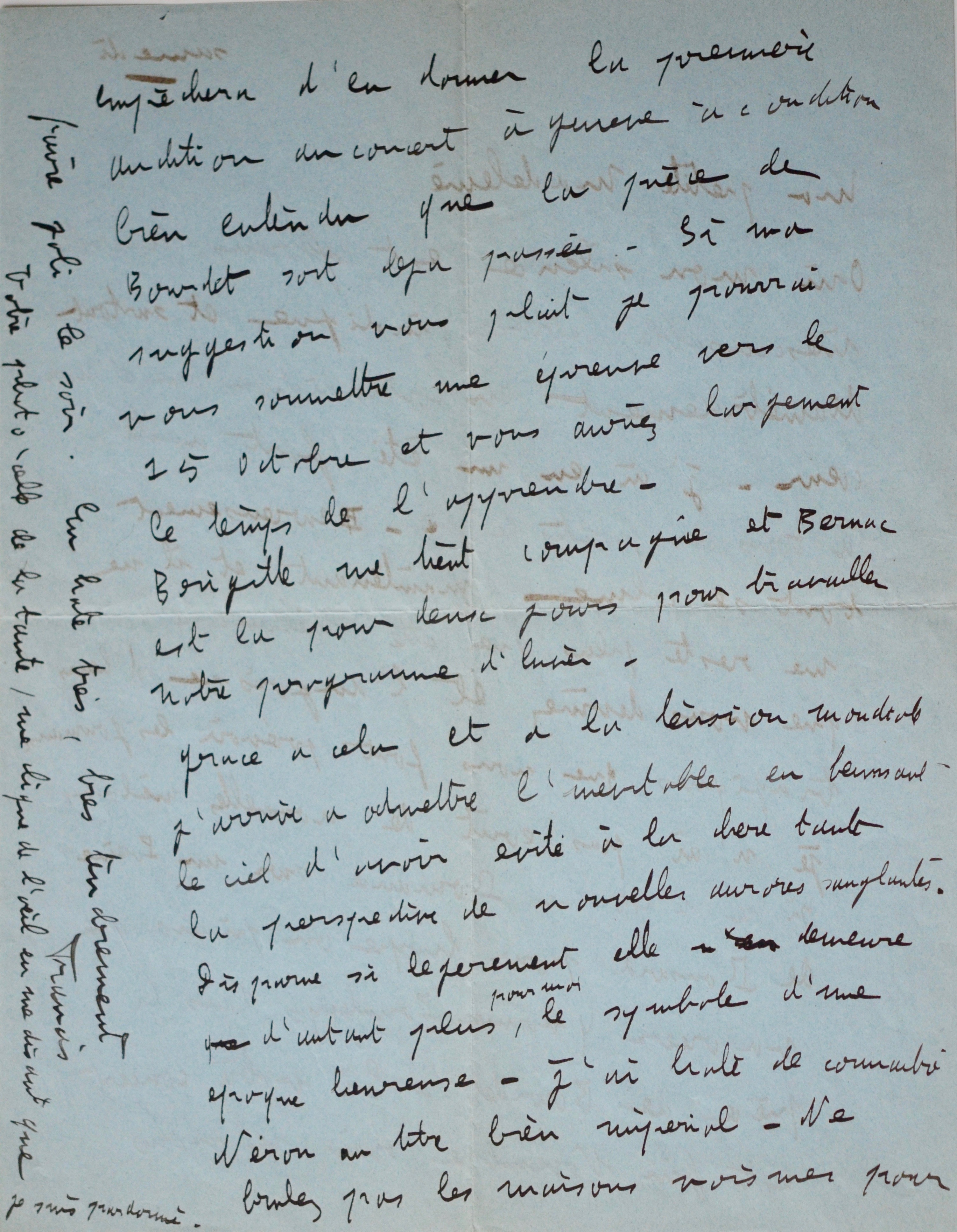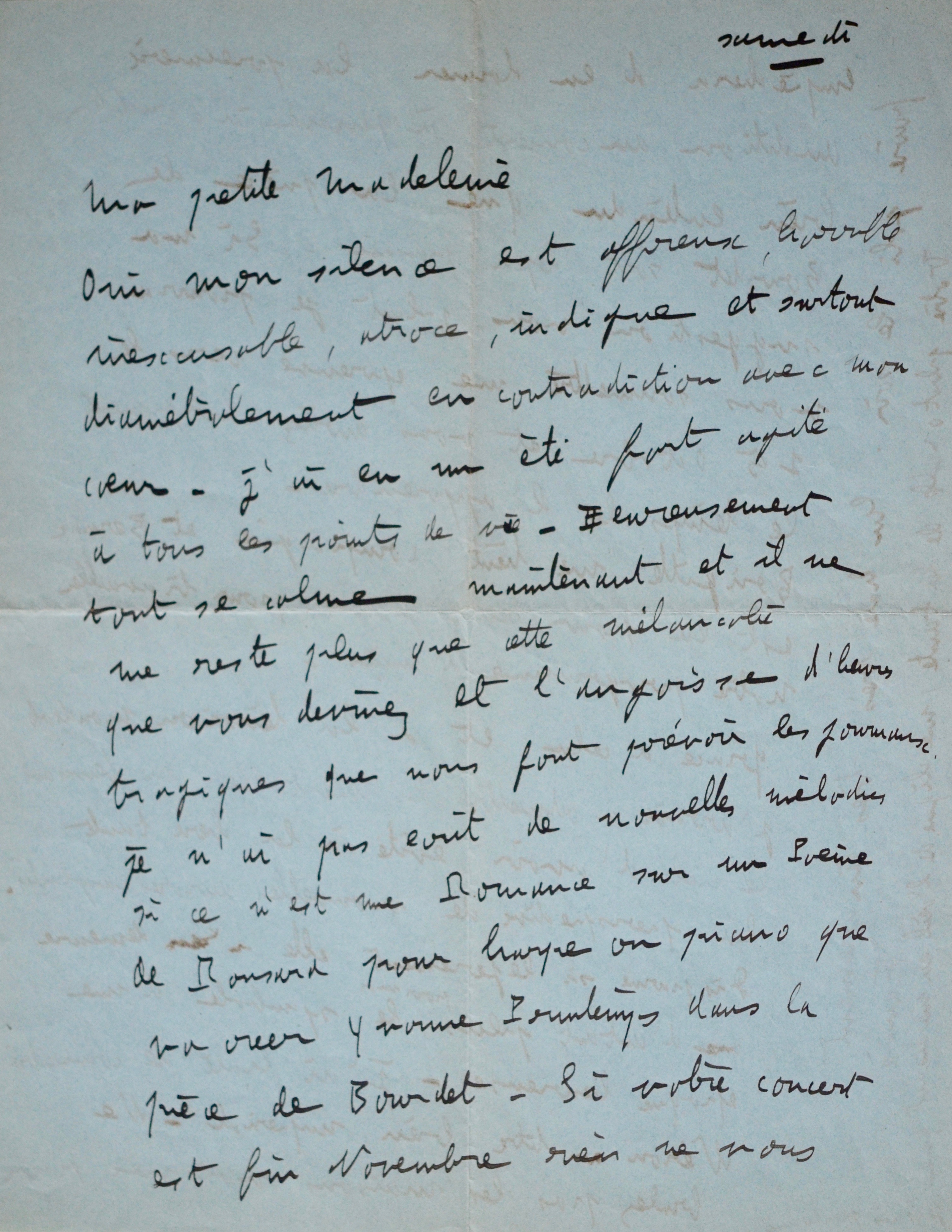 "Ma petite Madeleine. Oui mon silence est affreux, horrible, inexcusable, atroce, indigne et surtout diamétralement en contradiction avec mon coeur. J'ai eu un été fort agité à tous les points de vue. Heureusement tout se calme maintenant et il ne me reste plus que cette mélancolie que vous devinez et l'angoisse d'heures tragiques que nous font prévoir les journaux. Je n'ai pas écrit de nouvelles mélodies si ce n'est une Romance sur un poème de Ronsard pour harpe ou piano que va créer Yvonne Printemps dans la pièce de Bourdet. Si votre concert est fin novembre rien ne vous empêchera d'en donner la première audition au concert à Geneve à condition bien entendu que la pièce de Boudet soit déjà passée. Si ma suggestion vous plait je pourrai vous soumettre une épreuve vers le 15 octobre et vous aurez largement le temps de l'apprendre. [...] Grâce à cela et à la tension mondiale j'arrive à admettre l'inévitable en bénissant le ciel d'avoir évité à la chère tante la perspective de nouvelles aurores sanglantes. Disparue si légèrement elle demeure d'autant plus pour moi, le symbole d'une époque heureuse. J'ai brûlé de connaitre Néron au titre bien impérial. Ne brûlez pas les maisons voisines pour faire joli le soir. En hâte très, très tendrement. Francis. Votre photo, celle de la tante, me cligne de l'oeil en me disant que je suis pas endormi".