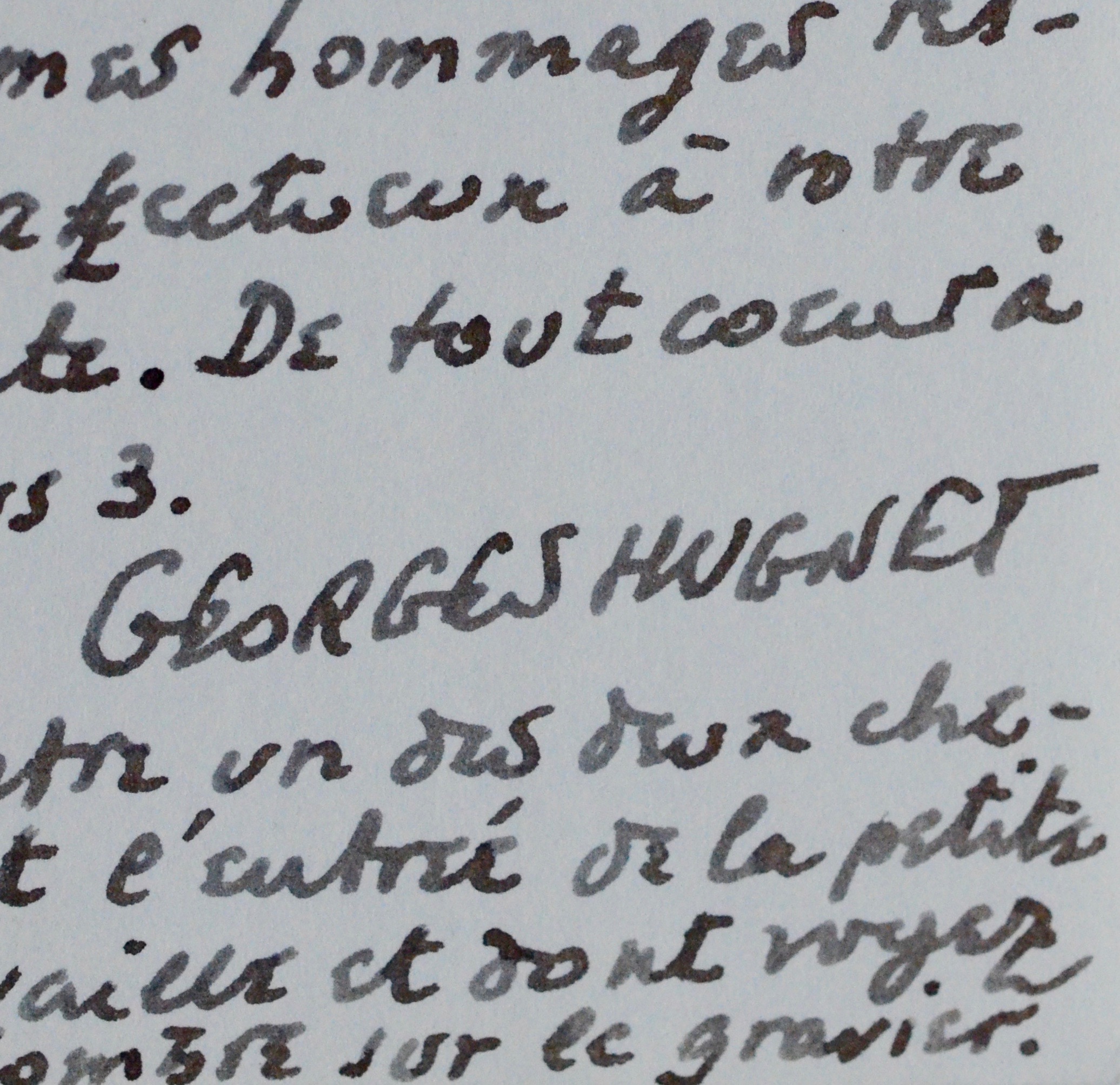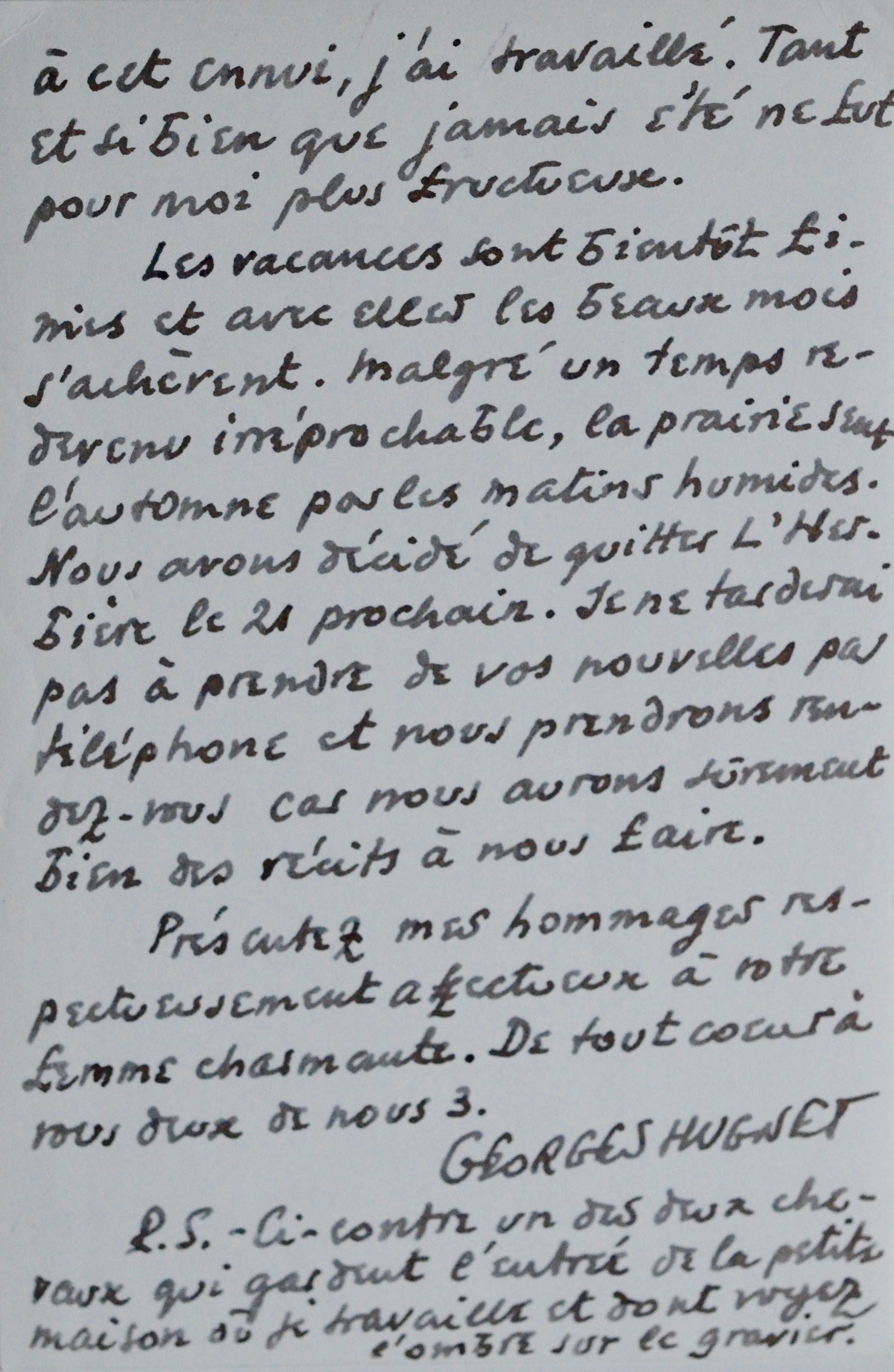 Georges Hugnet (Paris, 1906/1974)Lettre de Georges Hugnet écrite en bas et au dos d'une photographie originale. Il a observé le "repos prescrit par les médecins" et s'est beaucoup ennuyé. Pour échapper à cet état, il a beaucoup travaillé "tant et si bien que jamais été ne fut pour moi plus fructueux". Il reviendra bientôt à Paris et appellera son correspondant, "car nous aurons sûrement bien des récits à nous faire". Il ajoute "Ci-contre, un des deux chevaux qui gardent l'entrée de la petite maison où je travaille et dont [vous] voyez l'ombre sur le gravier".