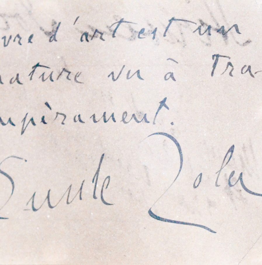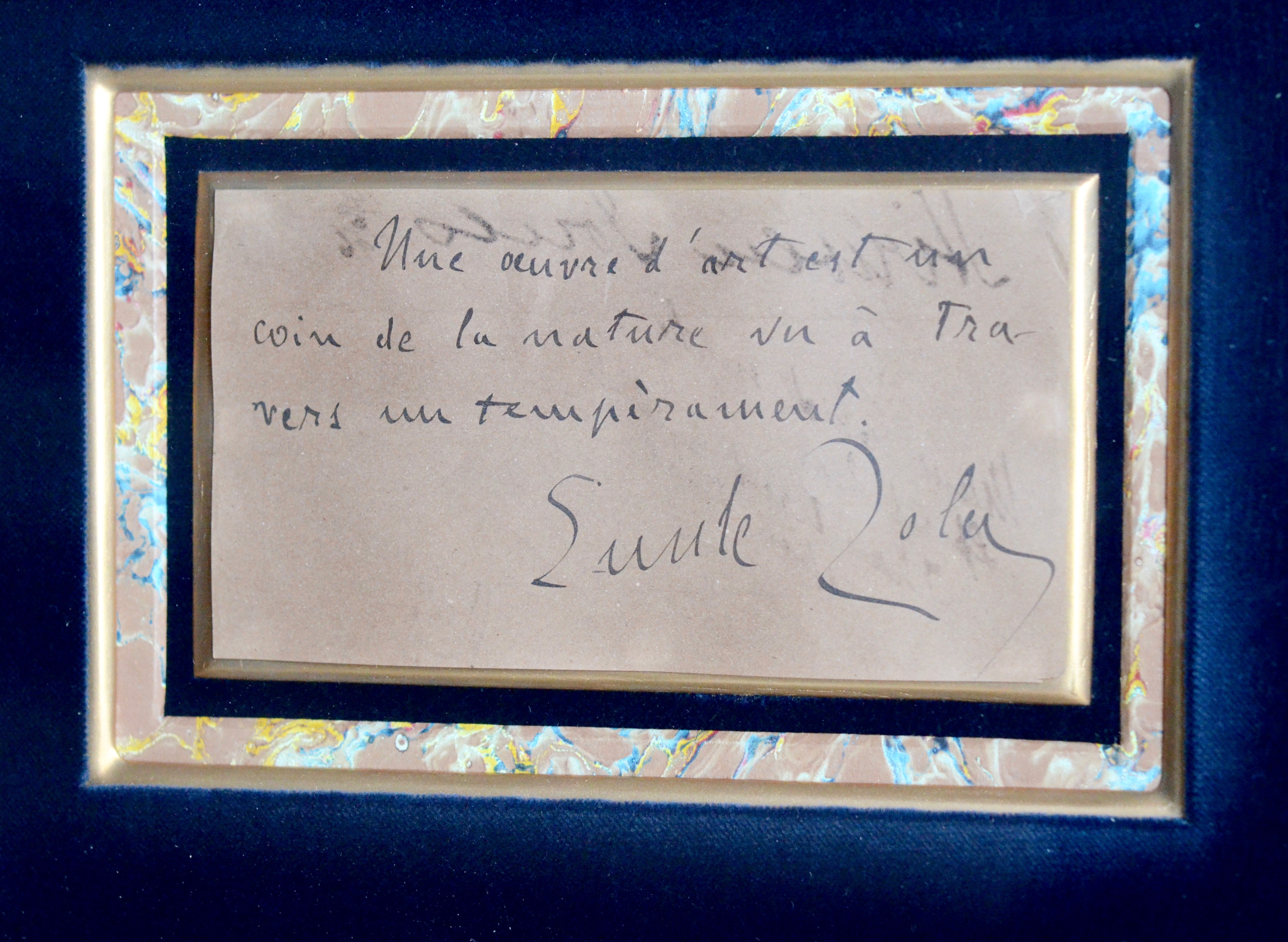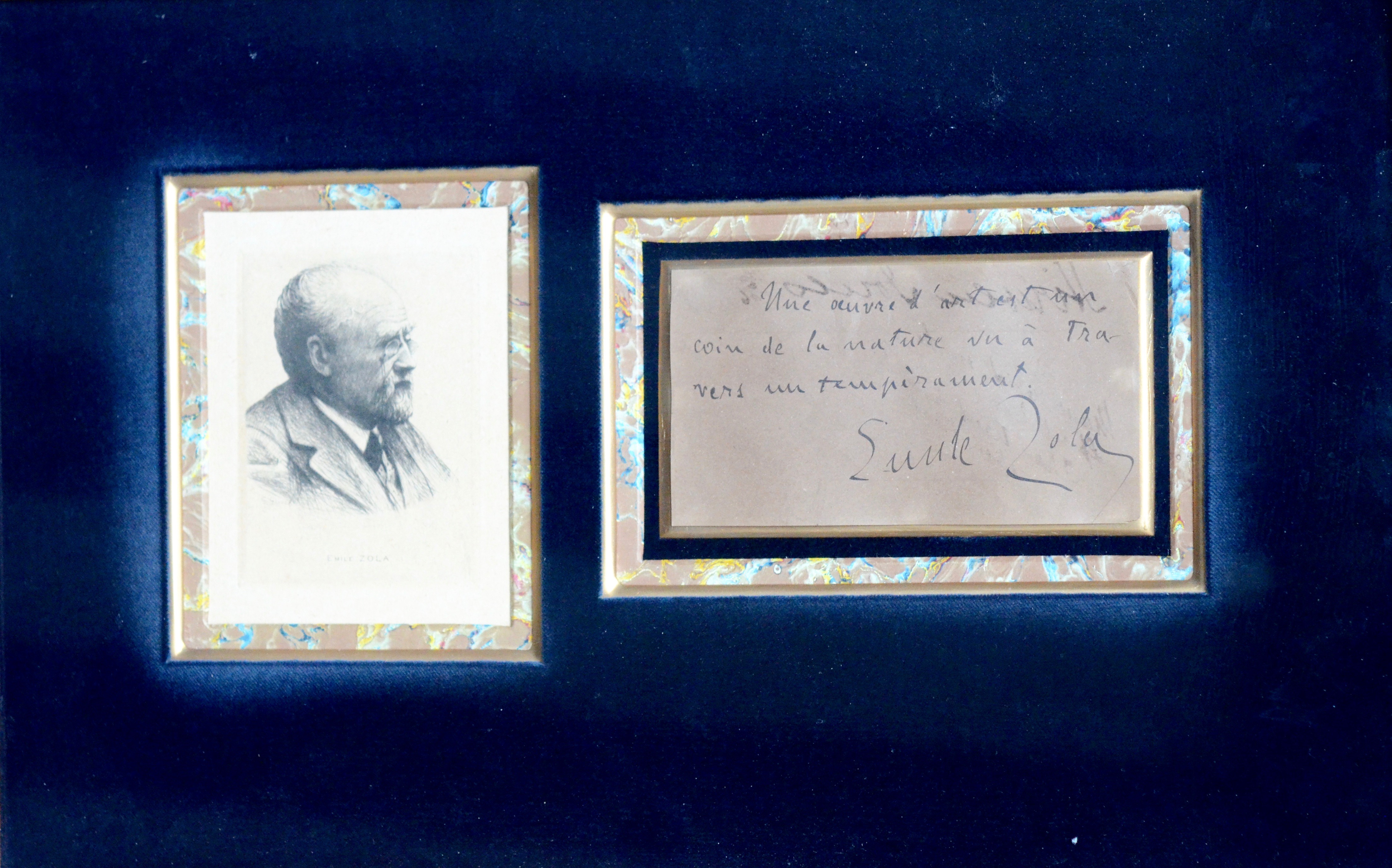 Bel aphorisme d'Émile Zola, dans un encadrement avec portrait gravé :