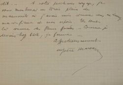 Eugène Marsan (Bari, 1882/1936)En plein travail, Eugène Marsan s'interrompt pour livrer le fond de sa pensée au sujet de l'échec de l'édition du roman de son ami, intitulé "Jean Lamy", dont il le tient pour responsable. "Vous avez écrit partout, vous avez fait savoir à son de trompe, que vous étiez prêt à faire les frais de l'édition. C'est fini : vous ne trouverez plus, en ce moment, à le faire éditer autrement. Voilà le châtiment de votre précipitation et de votre hâte. Vous me savez hostile à ce genre d'édition. Un jeune auteur peut faire éditer à ses frais une brochure, une plaquette de vers, une fantaisie. Il n'a pas le droit de donner ainsi un roman, une longue nouvelle, sous une forme, en ce cas, trompeuse. En outre, ça ne sert à rien, parce que tout le monde le sait. Il ne vous reste pour Jean Lamy que deux solutions" : soit faire imprimer un petit nombre d'exemplaires pour ses amis et la critique ou "2° Attendre. Le tiroir. Pas le feu. Le feu est bête. Il ne vous apprend rien. Vous serez content de revoir votre Lamy dans cinq ou dans dix ans [...]. Sachez pour finir que notre métier a pour première vertu la patience, que la vie d'un homme de lettres est une perpétuelle déception, et qu'il y faut être fort, très fort, affreusement fort. Tâtez vous bien, pour savoir si le coeur vous en dit... A votre prochain voyage, je vous montrerai un tiroir plein de manuscrits où j'avais mis comme vous en Lamy ma confiance et mon espoir. Ils sont là comme des fleurs fanées..."