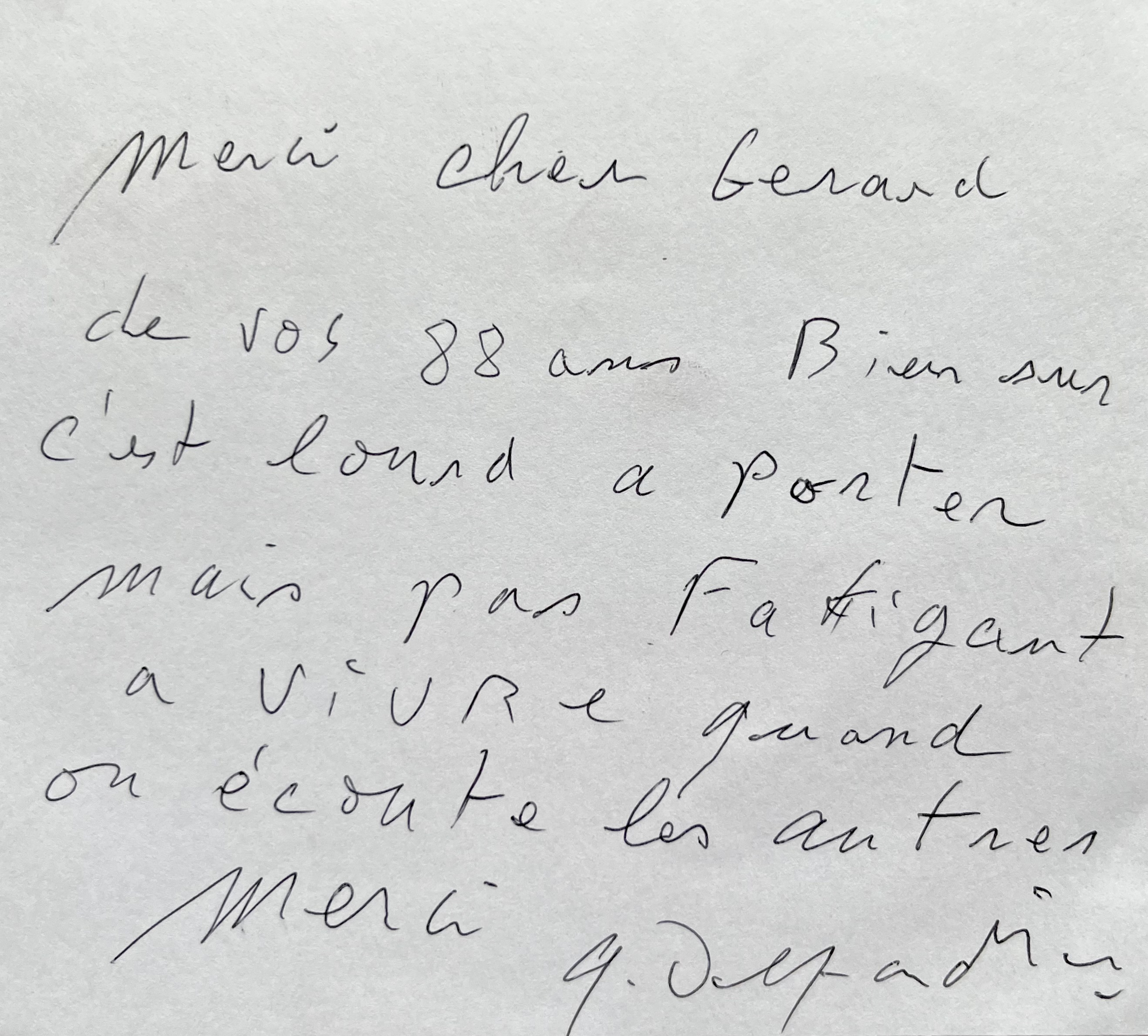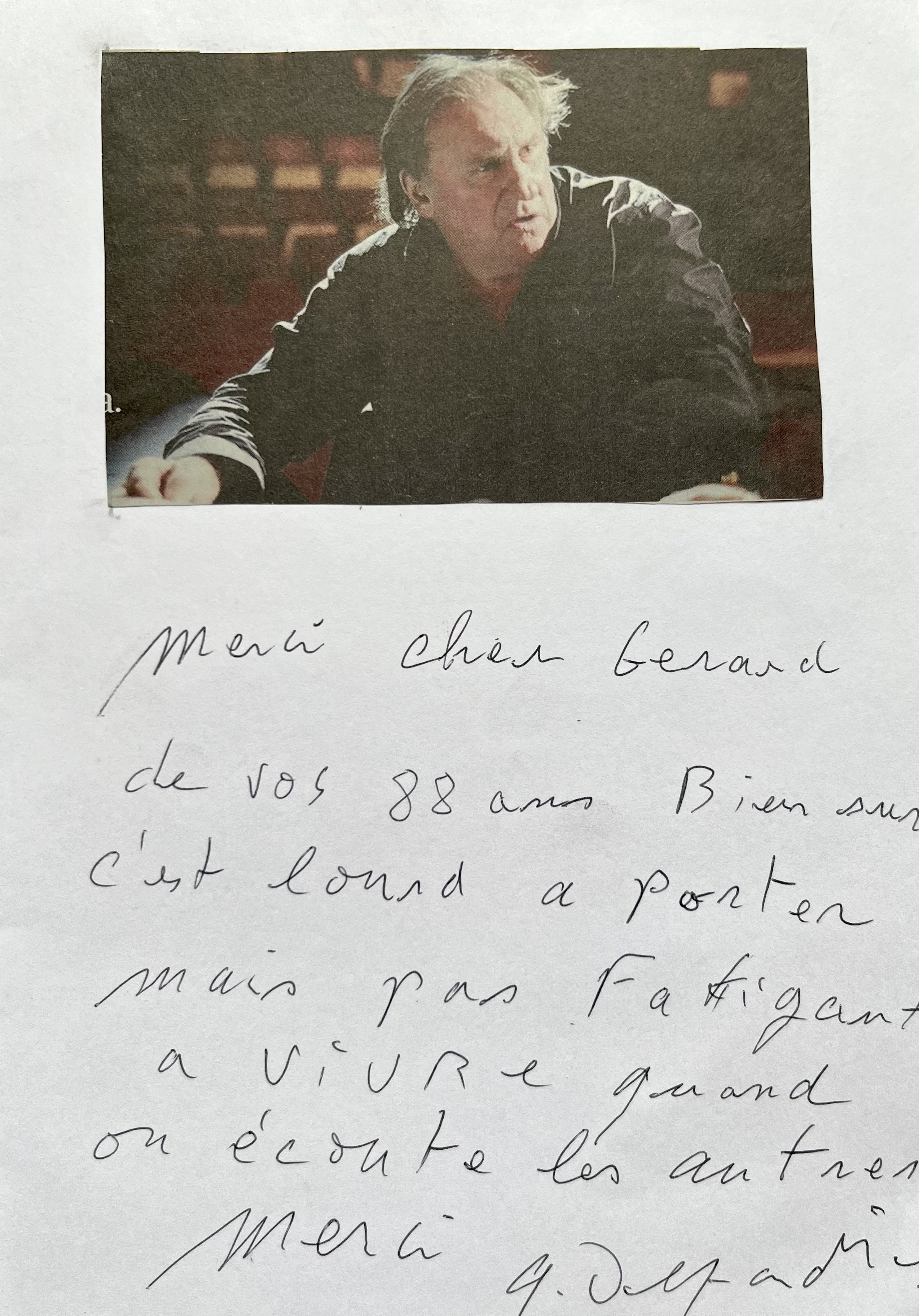 "Merci cher Gérard de vos 88 ans. Bien sur c'est lourd à porter mais pas fatigant à vivre quand on écoute les autres. Merci. G. Depardieu".