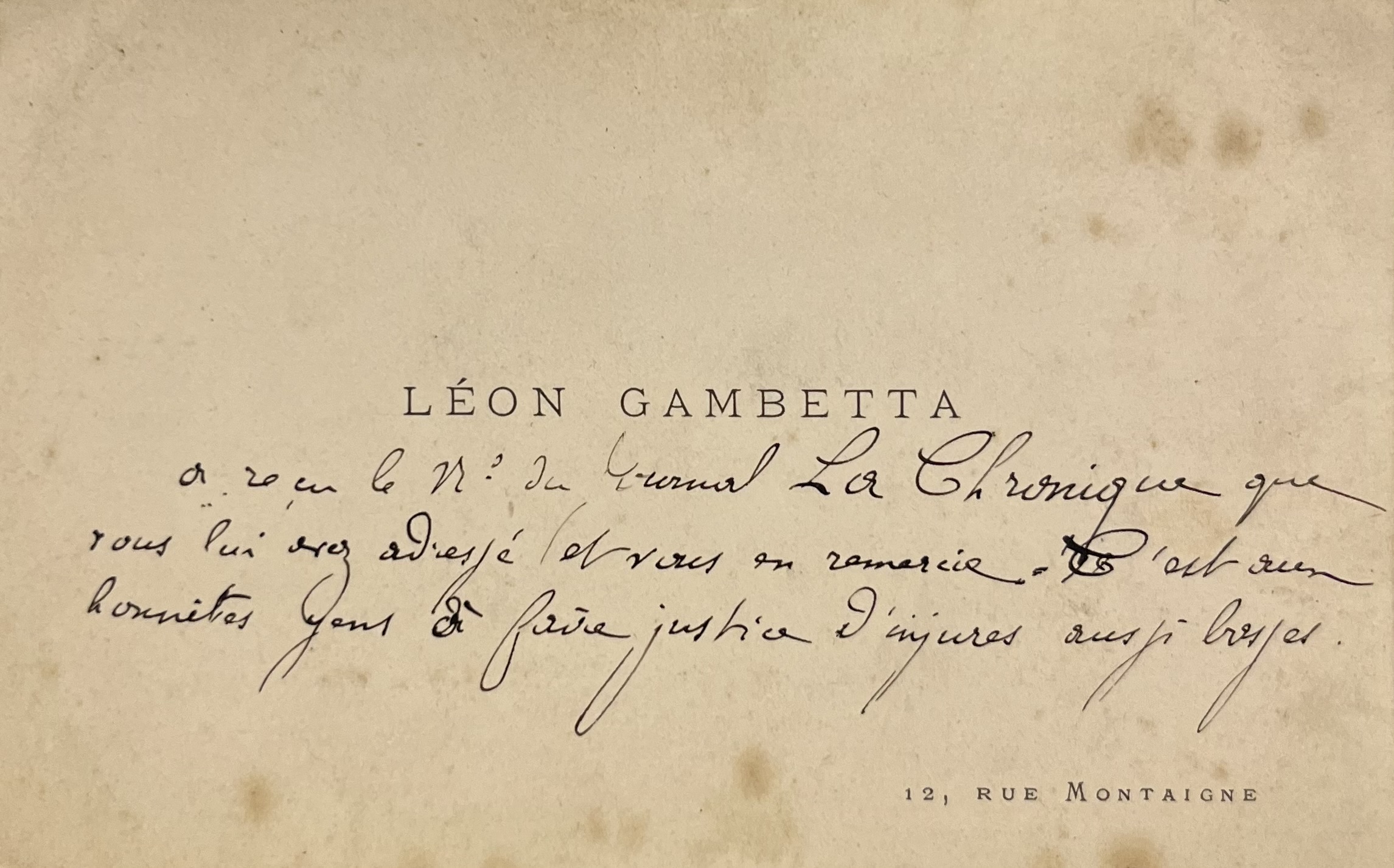 "[Léon Gambetta] a reçu le n° du Journal La Chronique que vous lui avez adressé et vous en remercie. C'est aux honnêtes gens de faire justice d'injures aussi basses".