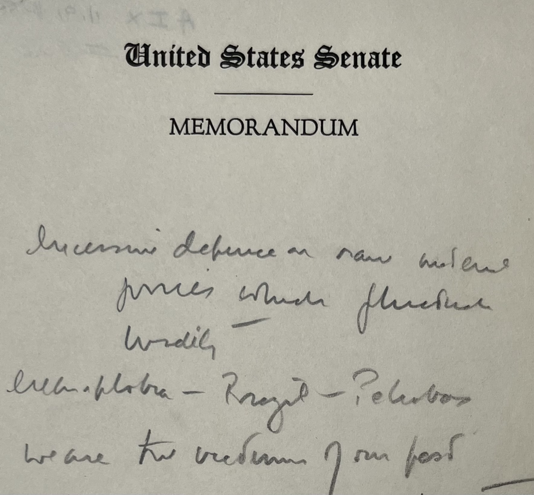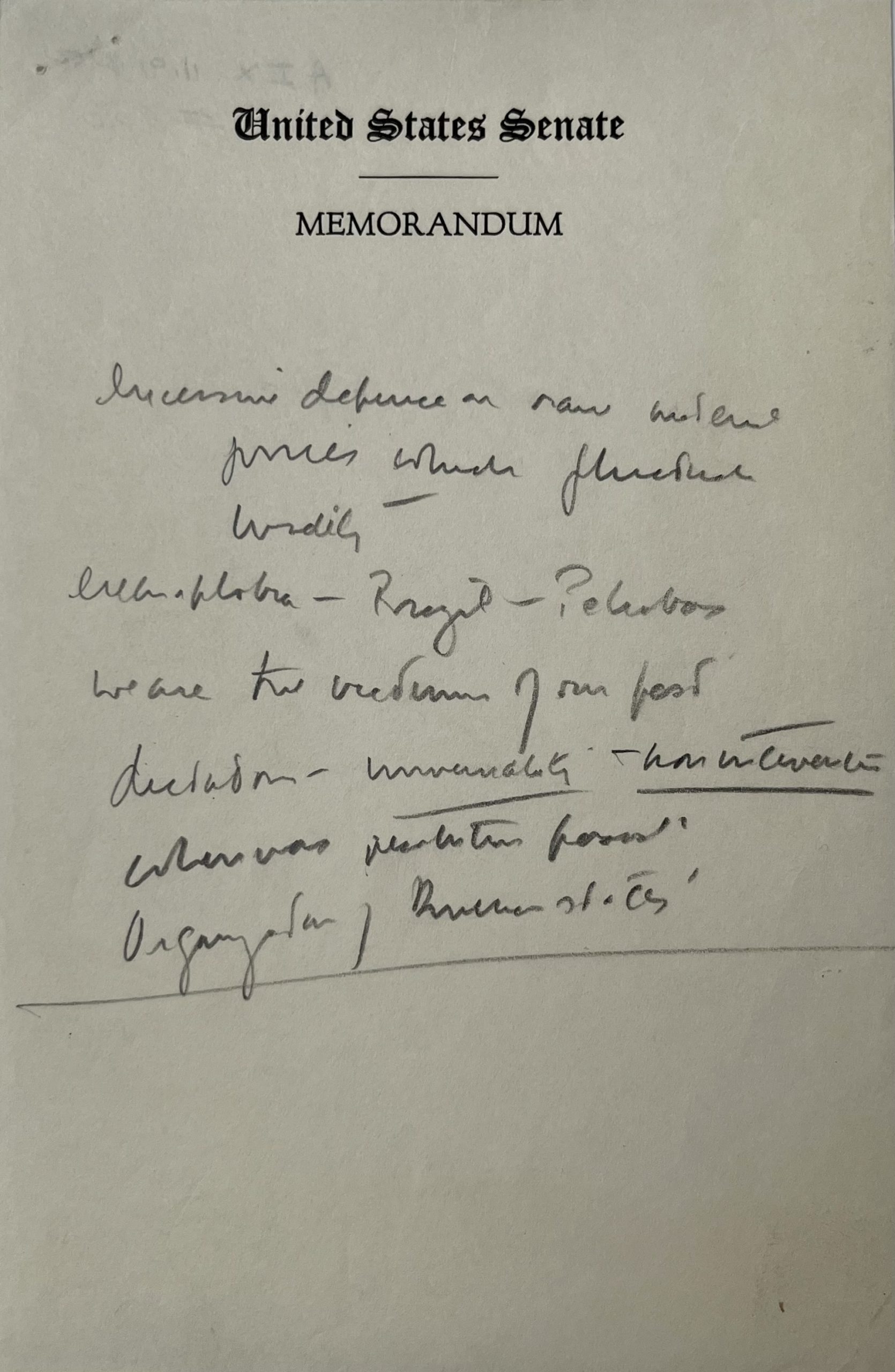 John Fitzgerald Kennedy (Brookline, Massachusetts, 1917/1963)Précieuses notes autographes de John F. Kennedy, alors sénateur du Massachusetts, rédigées au crayon sur un papier à l'en-tête du Sénat des États-Unis : "United States Senate - Memorandum".