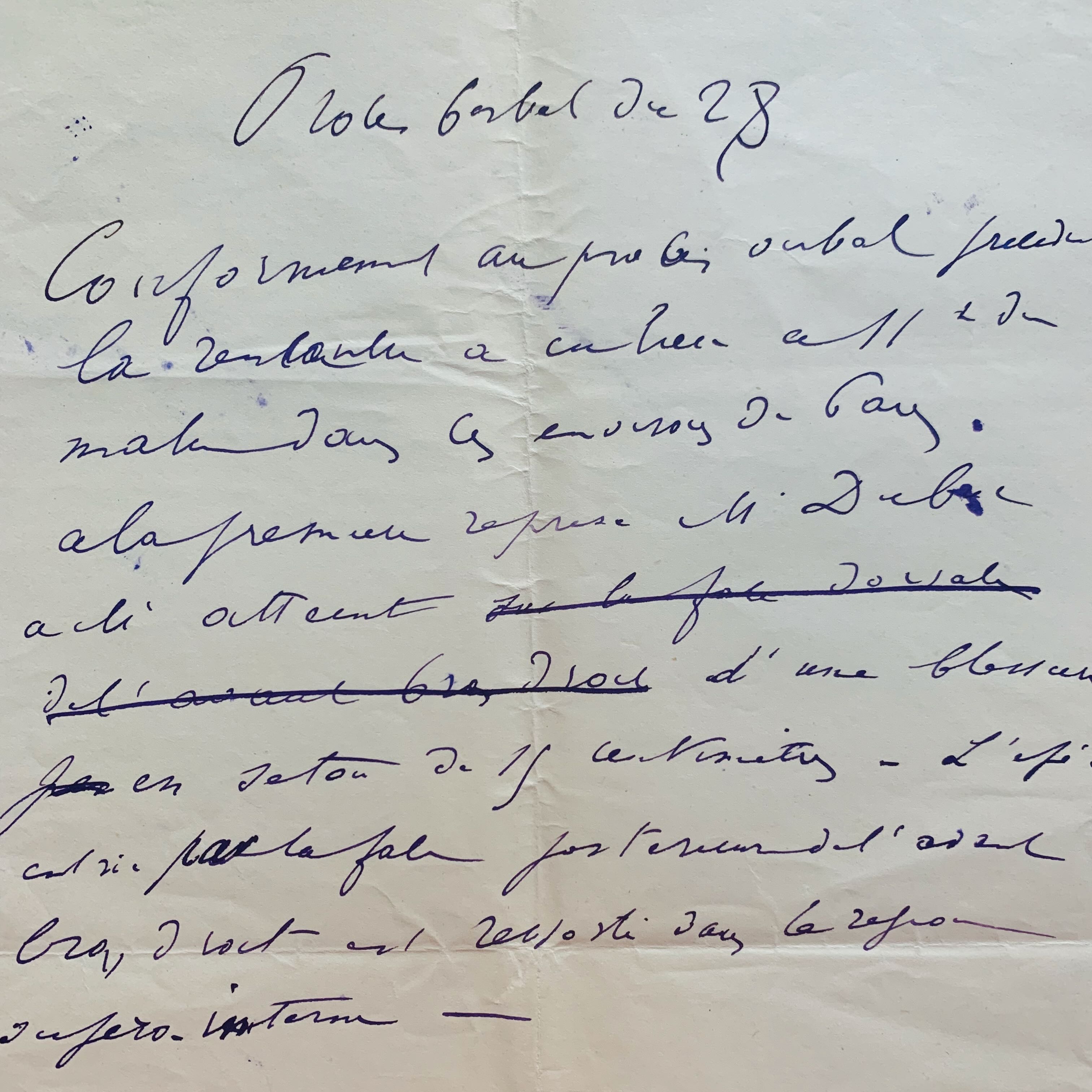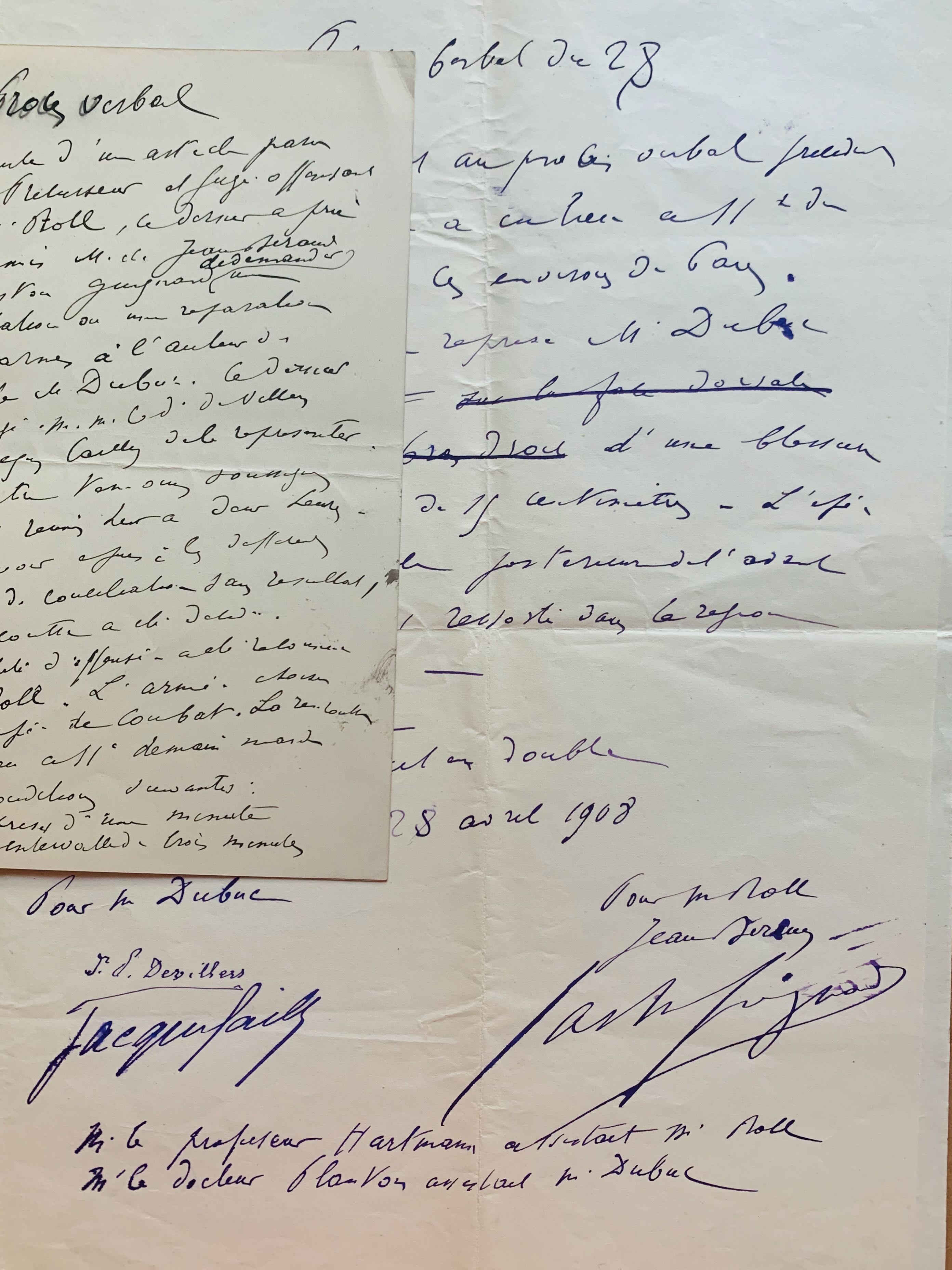 "A la suite d'un article paru dans le Précurseur [journal nationaliste et antisémite] et jugé offensant par M. Roll, ce dernier a prié ses amis MM. Jean Béraud et Gaston Guignard [1848/1922, peintre] de demander rétractation ou réparation par les armes à l'auteur de l'article, M. Dubuc. Ce dernier a chargé MM. Devillers et Jacques Gailly de le représenter. Les quatre témoins soussignés se sont réunis hier à deux heures. Après avoir épuisé les différents moyens de conciliation sans résultat, une rencontre a été décidée. La qualité d'offensé a été reconnue à M. Roll. L'arme choisie a été l'épée de combat. La rencontre aura lieu à 11h demain mardi, aux conditions suivantes : reprises d'une minute avec intervalle de trois minutes, gants de ville à volonté. Le terrain acquis restera acquis. La direction du combat, le choix des armes et de la place sera tiré au sort [...]". Le 28 avril 1908, est le jour du duel. Le procès verbal est dressé par Jean Béraud : "Conformément au procès verbal précédent, la rencontre a eu lieu à 11 h du matin dans les environs de Paris. A la première reprise, M. Dubuc a été atteint d'une blessure en séton de 15 centimètres. L'épée entrée par la face postérieure de l'avant-bras est ressortie dans la région supéro-interne [...]". Ces deux procès-verbaux, dressés en double exemplaires, sont signés par les quatre témoins.