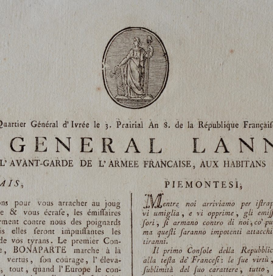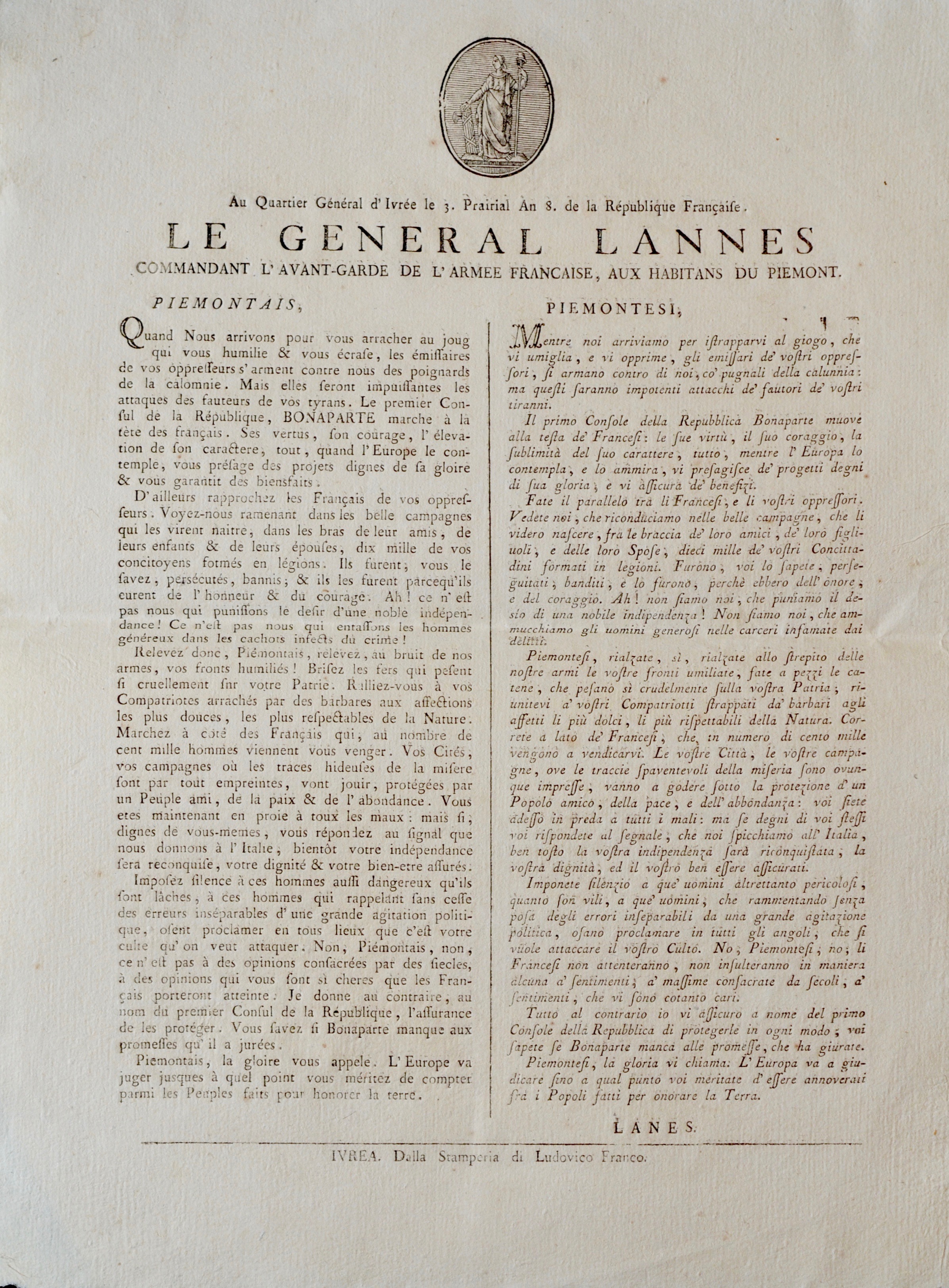 Jean Lannes (Lectoure, 1769/1809)Affiche bi-lingue français-italien d'une proclamation du général Lannes incitant les Piémontais à se rebeller et rejoindre les armées et les idéaux de la République : "Le général Lannes commandant l'avant-garde de l'armée française, aux habitants du Piémont".
