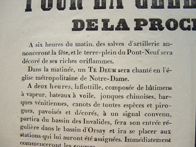 Affiche du "Programme officiel des fêtes et cérémonies qui auront lieu dans Paris le 4 mai [1851] pour la célébration du 3e anniversaire de la proclamation de la République". «[...] Un orchestre sera établi sur le port d'Orsay. La Madeleine sera décorée de guirlandes entre les colonnes, et, sur les murs d'échiffre, seront placées deux grandes statues symboliques. Les fontaines de la place de la Concorde seront surmontées et entourées de corbeilles de fleurs. Une partie des colonnes rostrales aura une décoration analogue. Sur l'avenue des Champs-Elysées seront placées seize statues d'illustrations nationales, ainsi que des mâts garnis de trophées, d'écussons et de bannières [...]». Sont également prévus des courses en canot, des jeux, une flotille sur la Seine, un Te Deum à Notre-Dame, etc.