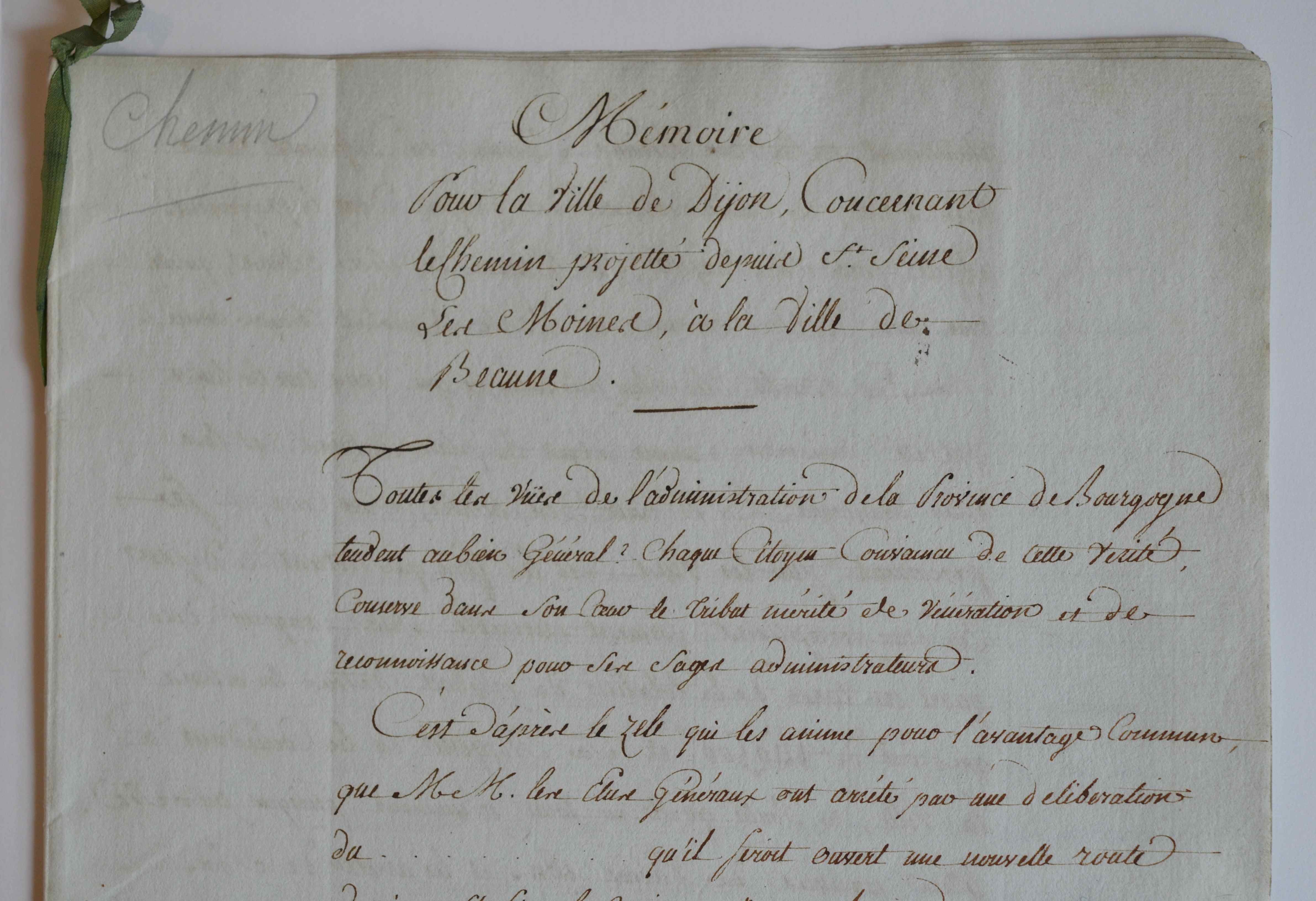Manuscrit titré : "Mémoire pour la ville de Dijon, concernant le chemin projetté depuis St Seine Les Moines, à la ville de Beaune". L'auteur justifie cet aménagement par la nécessité de faciliter l'approvisionnement de la capitale bourguignonne en vins et denrées. «La ville de Dijon n'a donc de ressource pour se procurer le bled et les bois nécessaires pour la nourriture et le chauffage de ses habitans que dans les villages situés sur la rivière d'Ouche, l'Auxois et une partie du bailliage de la Montagne, et tous ces villages habitués, forcés même par le défaut d'autres débouchés, à apporter leur bled à Dijon en approvisionnant abondamment les marchés, d'où il refluoit dans la partie méridionale de la province, par le concours de grand nombre de voituriers, qui ne conduisent du vin à l'Etape que parce qu'ils étoient certains de ramener par contrevoitures du bled dans le lieu de leur demeure. Il est de fait que les vins qui fournissent essentiellement l'Etape de Dijon, viennent de Nolay, Decize, Santenay, St Gilles, De Nevy, St Léger, Couche, Chagny, Remigny, Demigny, Fontaine, Corpeau, etc. que ce qui décide les voituriers de ces différents pays à se charger de conduire des vins à l'Etape, c'est la certitude qu'ils ont de ramener en contrevoitures des bleds, froment, Cousceaux, orge et avoine pour leurs besoins [...]».