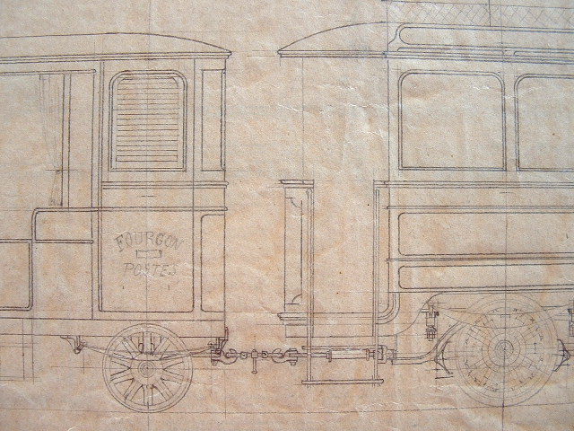 2 dessins à la mine de plomb, sur calque : automotrice à plate-forme avec, en marge, le calcul du poids total en charge (14 voyageurs) et autre modèle d'automotrice à plate-forme, à laquelle est attelé un fourgon postal.
