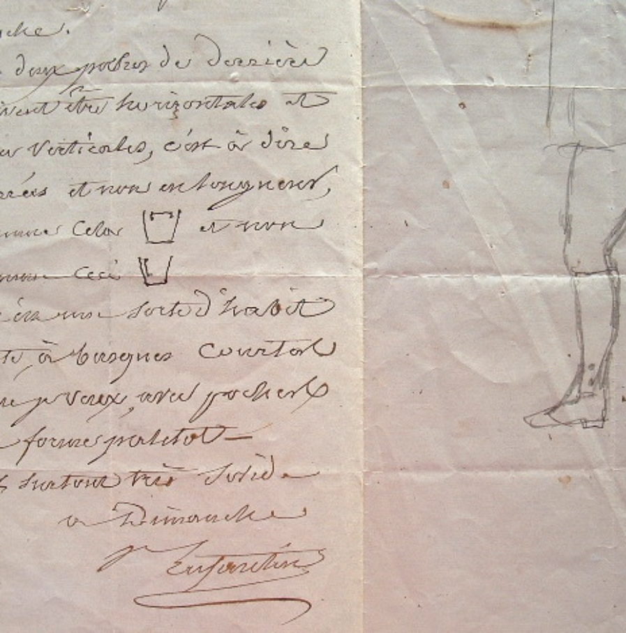 Prosper Enfantin donne ses intructions pour la confection d'une veste de chasse «d'une étoffe très solide, en velours rayé, avec poches des deux côtés, en dessous sur la poitrine et en dessus sur les hanches, boutons de métal unis». Comme c'est pour chasser avec M. Suisons, il souhaite qu'elle soit semblable à la sienne. «Mettez aussi une petite poche en dehors sur la poitrine à gauche. Les deux poches de derrière doivent être horizontales et non verticales, c'est à dire carrées et non en longueur [...]». Il agrémente son explication d'un croquis.