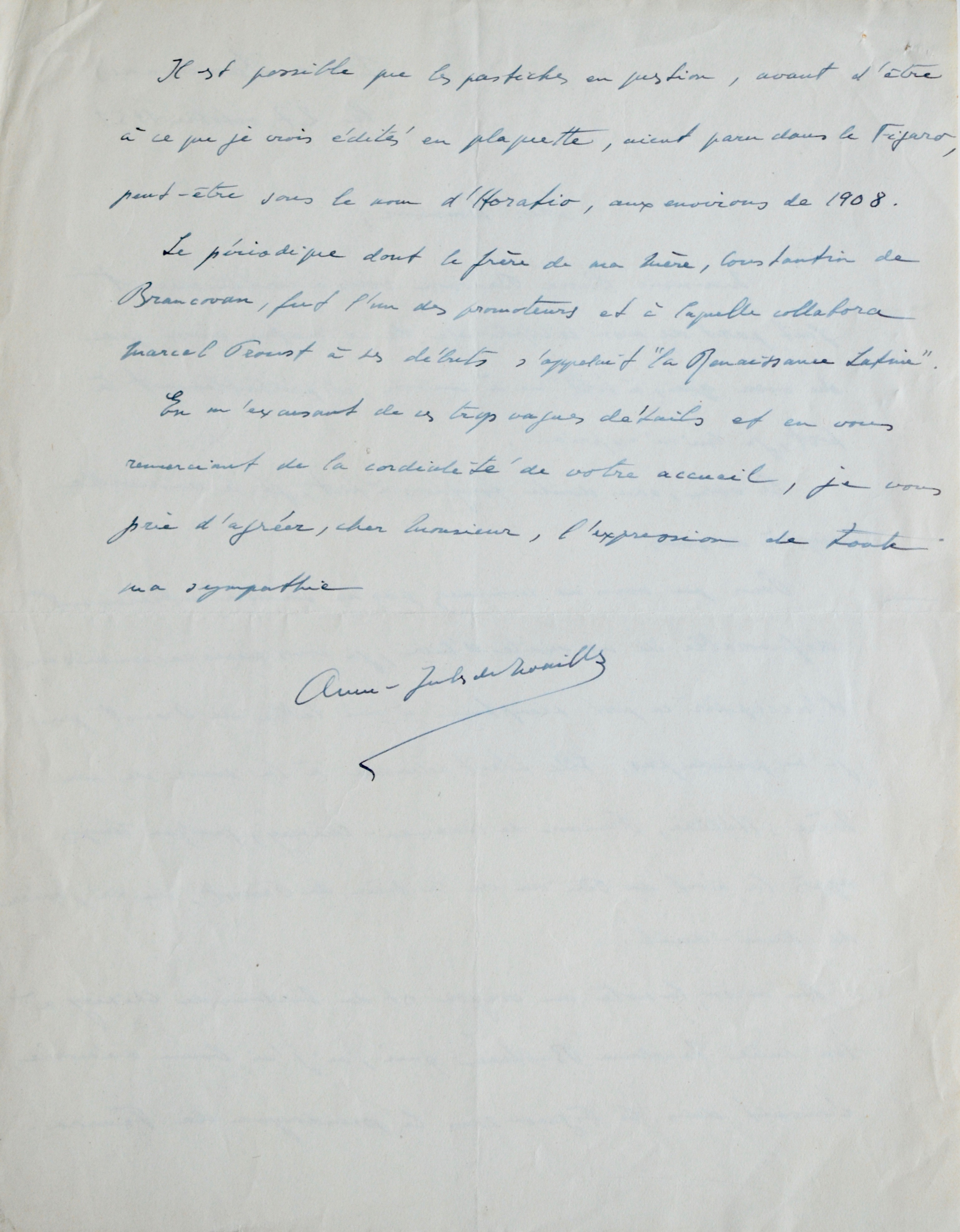 Il s'agit de la fin d'une lettre perdue et inconnue à Philip Kolb. Ce post-scriptum suivait probablement à la lettre que Proust écrivit peu avant le 4 avril 1908 à la princesse et dans laquelle il sollicitait son intervention pour obtenir des conseils de Paul Hervieu au sujet de ses pastiches (Correspondance, Paris, Plon, t.XXI, n°470). Une lettre du 4 avril 1908 remercierait la princesse pour son intervention (Correspondance, Paris, Plon, t.XXI, n°471).