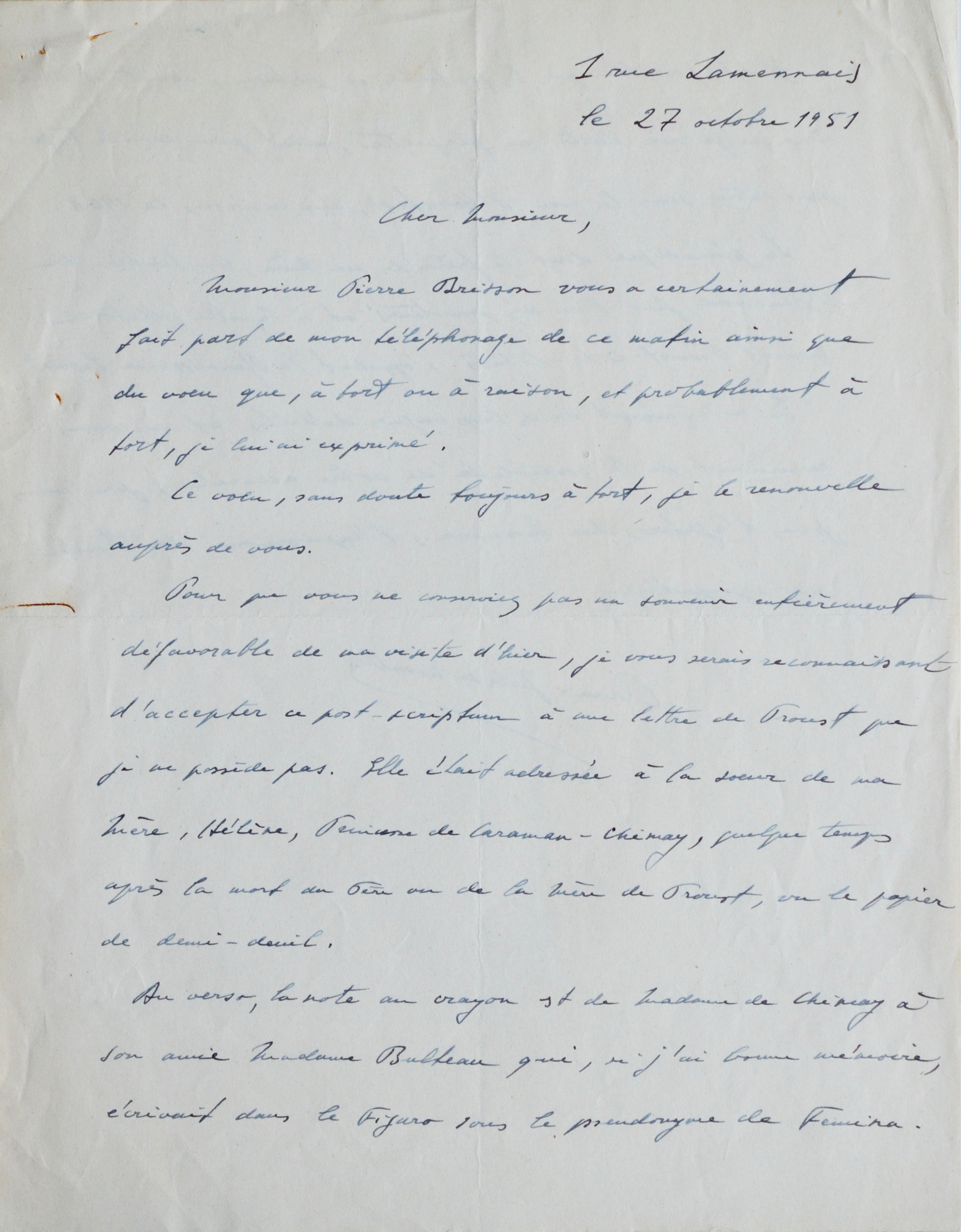 -Anne-Jules de Noailles. Lettre autographe signée à un "cher Monsieur". Paris, 27 octobre 1951. Fils d’Anna de Noailles et donc neveu de la princesse de Caraman-Chimay, Anne-Jules de Noailles donne des précisions sur le post-scriptum de Marcel Proust.