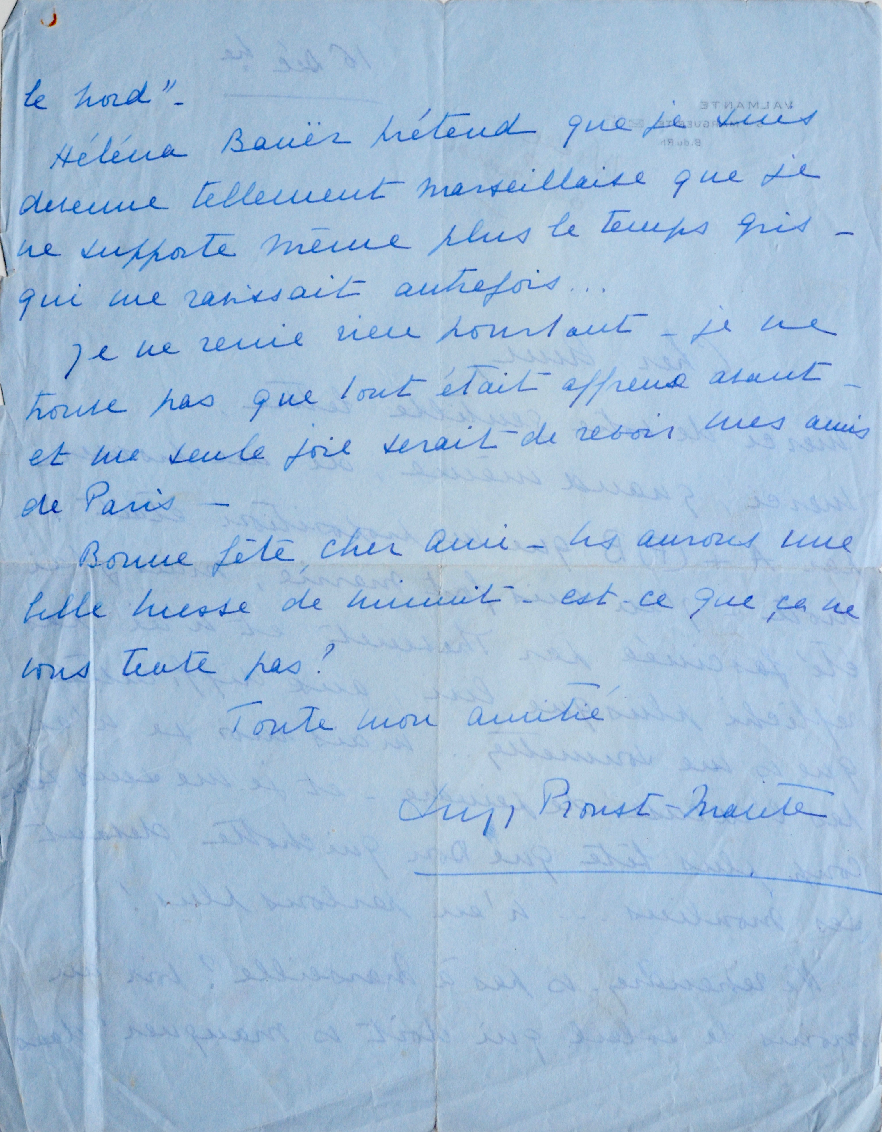 -Suzy Mantes-Proust. Lettre autographe signée à un «cher ami». Valmante dans les Bouches-du-Rhône, "16 décembre". Elle était la fille de Robert Proust et donc nièce de Marcel Proust.