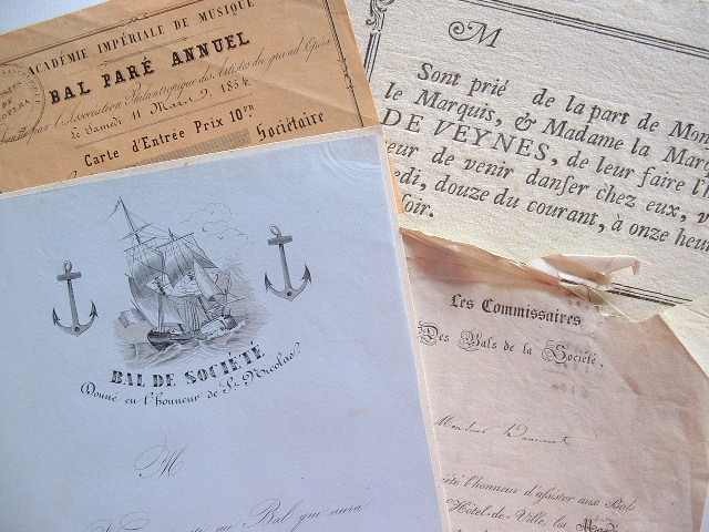 Quatre billets d'invitations imprimés pour des bals : un du milieu du XVIIIe par le marquis et la marquise de Veynes invitant à venir danser chez eux à onze heure du soir ; un billet pour le bal paré annuel de l'Académie Impériale de Musique pour le comédien Adice (signé par le président Lenfant, 1854, au profit de l'Association philanthropique des artistes du grand Opéra) ; un pour un "bal de société donné en l'honneur de St Nicolas" à la salle Flore (orné d'une jolie gravure de marine, milieu du XIXe) ; un donné par les "commissaires des bals de la société" (abîmé, Péronne 1836).