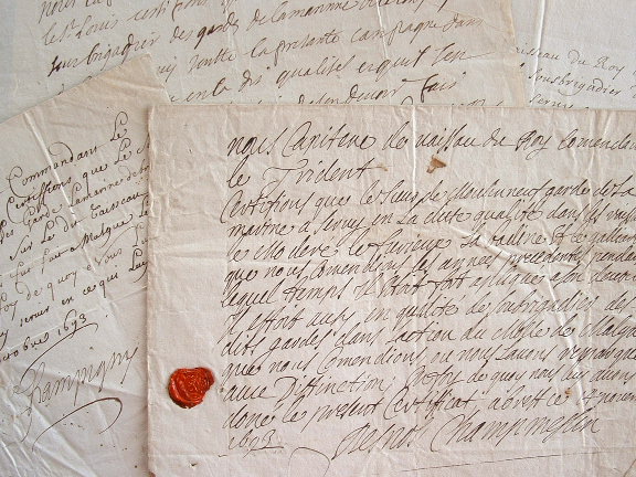 Quatre certificats délivrés par différents capitaines de vaisseaux en faveur du sieur de Moulinneuf, garde de la Marine, pour ses services à bord des bâtiments du roi. 1. Gilles Des Nos de Champmeslin (qui termina sa carrière comme lieutenant général des armées navales et commandant en chef dans toutes les mers, îles et terres fermes d'Amérique méridionale) : certificat comme capitaine du Trident pour ses services à bord du Modéré, du Furieux, de la Badine et du Gaillard (petit cachet de cire armorié) ; il loue en particulier ses initiatives lors de «l'action du molle de Malgue que nous commandions». 2. Champigny, capitaine de vaisseau commandant le Juste : certificat pour la dernière campagne «lequel s'est trouvé au détachement qui fut fait à Malgue». 3. Rouvroy, capitaine de vaisseaux commandant le Saint-Louis : certificat pour ses services durant la dernière campagne à bord de ce vaisseau. 4. D'Oroigne, capitaine de vaisseaux : certificat pour ses services au port de Calais ; «il s''est trouvé au bombardement dans le fort de bois où nous commandions [...] il s'est fort bien acquitté de son devoir [...]». [Moulinneuf termina sa carrière comme lieutenant des vaisseaux du roi, et capitaine d'une compagnie franche de Marine ; il est mort en 1745].