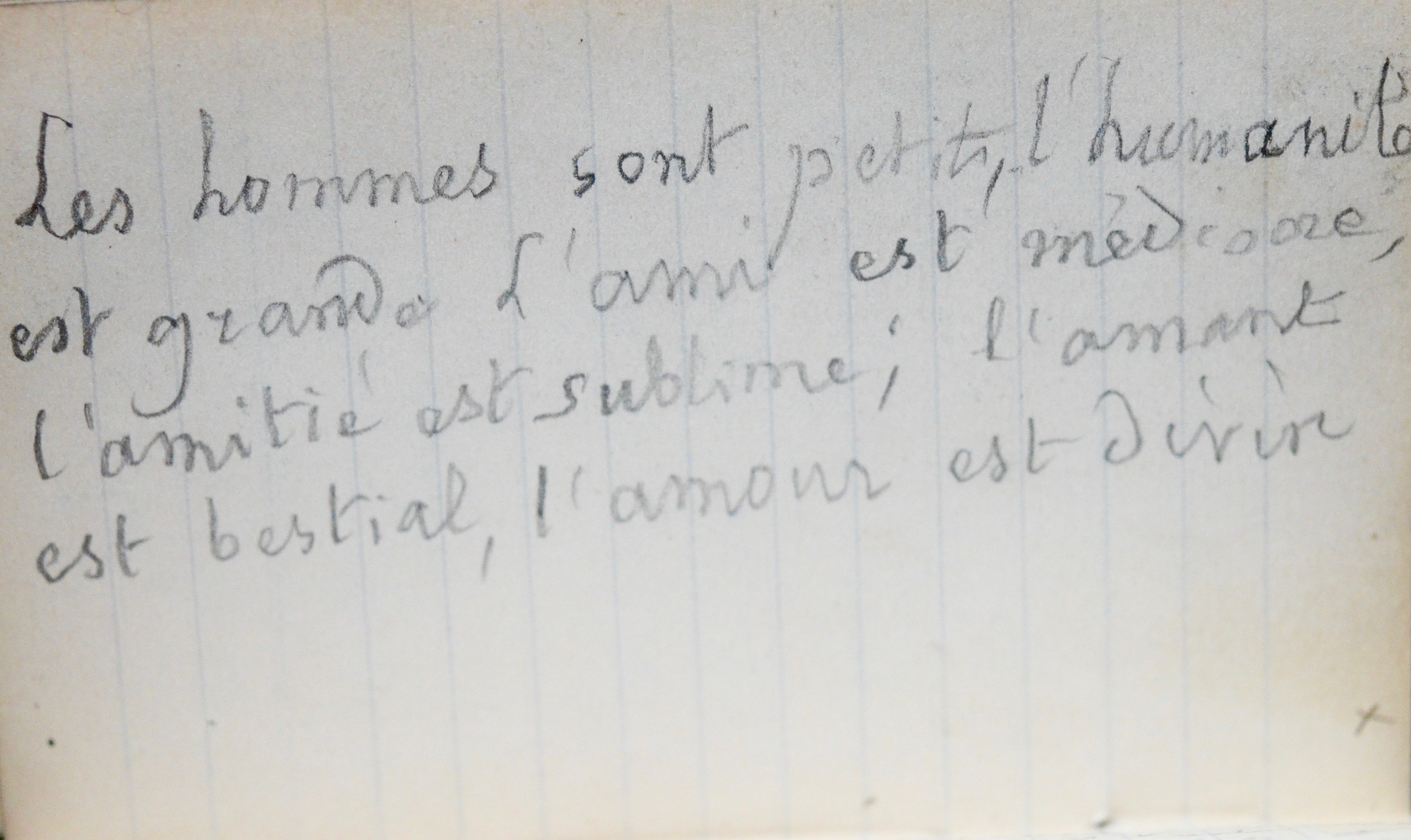 1-Idées, maximes et réfexions pêle-mêle (65 pp. écrites) : «Je ne vois pas d’issue», «Mais non, je sais, moi, que je ne m’avilis pas, je me relève», «La mort et l’amour sont deux renouvellements», «Pour sa vie à sauver perd les raisons de vivre», «âcre plaisir qu’on prend à tourmenter une cicatrice», «J’aime aimer et je hais haïr», «Se conserver dans l’alcool de la pensée», «C’est surtout par l’amour que l’homme tient à la bête et aussi qu’il tient à Dieu. L’amour est le point d’interrogation par lequel l’homme tient à l’animal et par lequel il tient à Dieu», «Le cœur n’a pas le droit d’être bêta, c’est bon pour l’esprit», «L’avenir n’est qu’à ceux qui travaillent pour lui», «Ce qu’il faut, c’est que la révolution sociale sort [sic], non une révolution mais une évolution», «Je fais le plus grand e ort pour être, mais je ne veux faire aucun e ort pour paraître», «Les hommes sont des poux ; l’humanité c’est Dieu»,