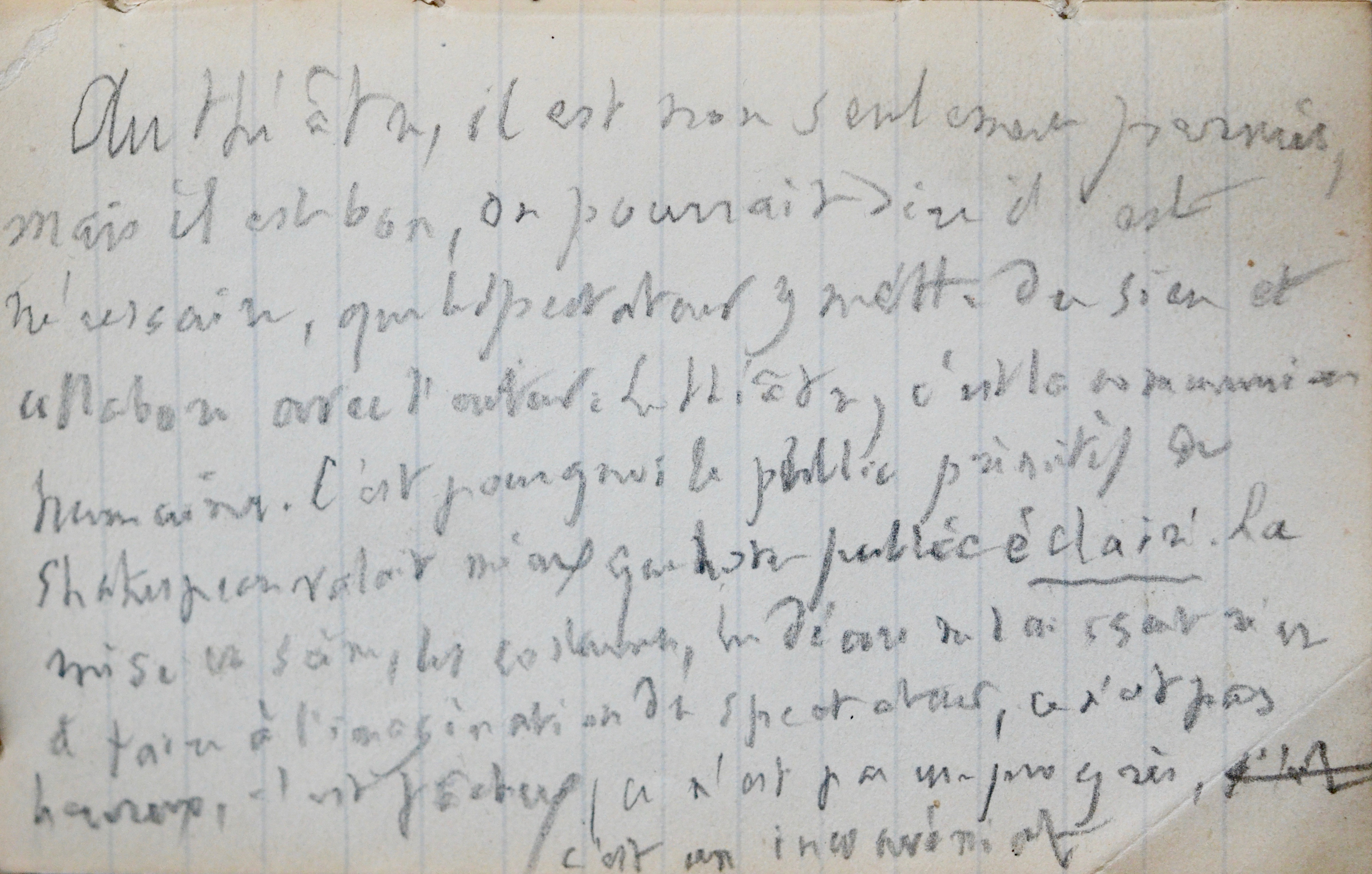 4-Idées et courts textes sur des sujets divers, avec des considérations sur ses contemporains (120 pages écrites) : « Lamartine est un lac. Il ne reflète que l’azur. Victor Hugo est un océan. Lamartine est bleu. Victor Hugo est rouge / Je ne crois pas que Lamartine ait l’avenir / Sainte-Beuve, grand critique des médiocres, médiocre critique des grands. Il avait trois bêtes noires : Victor Hugo, Michelet et Balzac ! / Ce qui fait la grandeur de Victor Hugo, c’est d’avoir ajouté aux dons de génie qu’il avait reçus, tout ce que peut donner la volonté, l’e ort, le labeur continu, le labeur obstiné. Né poète, il s’est fait artiste [...] ».