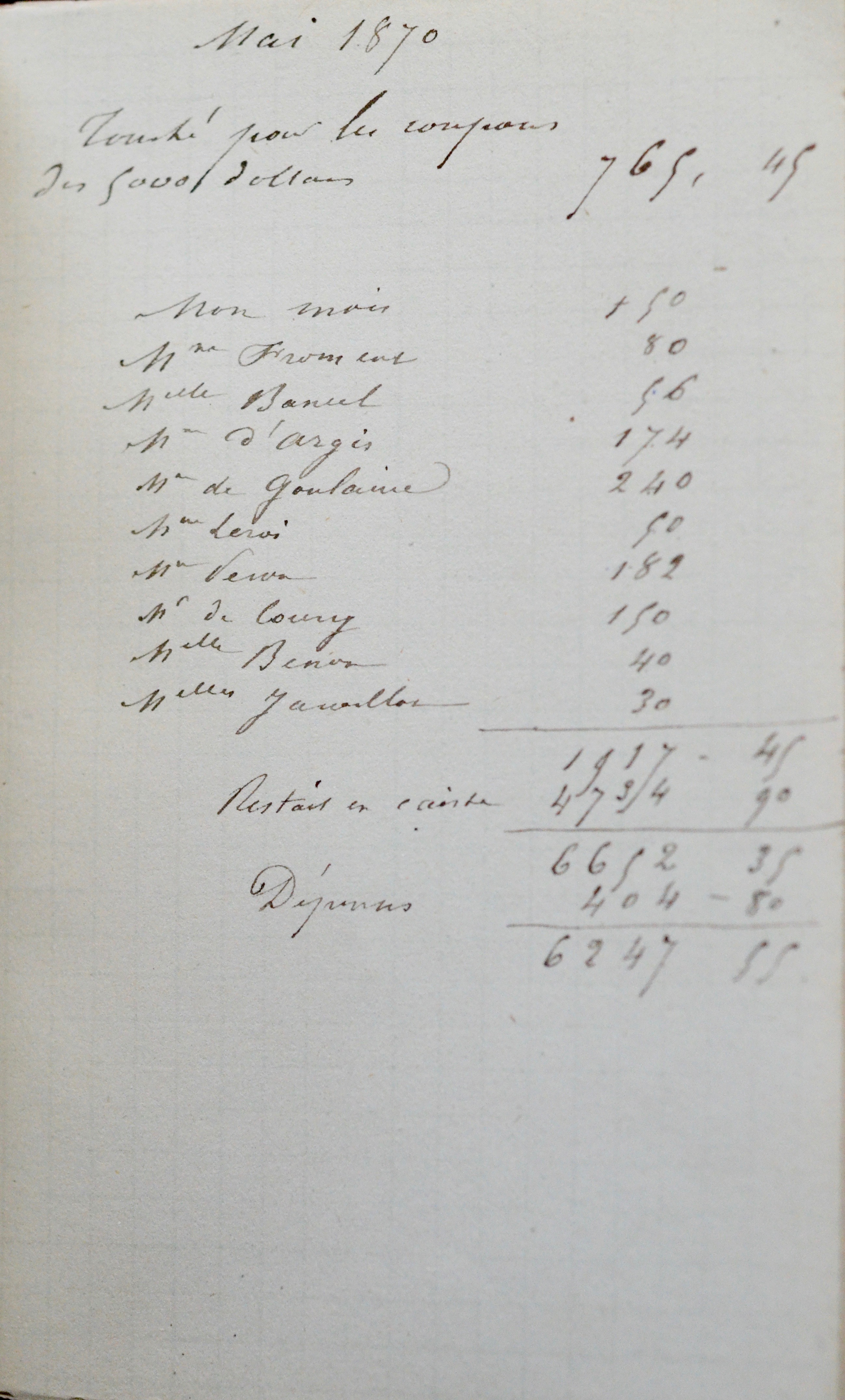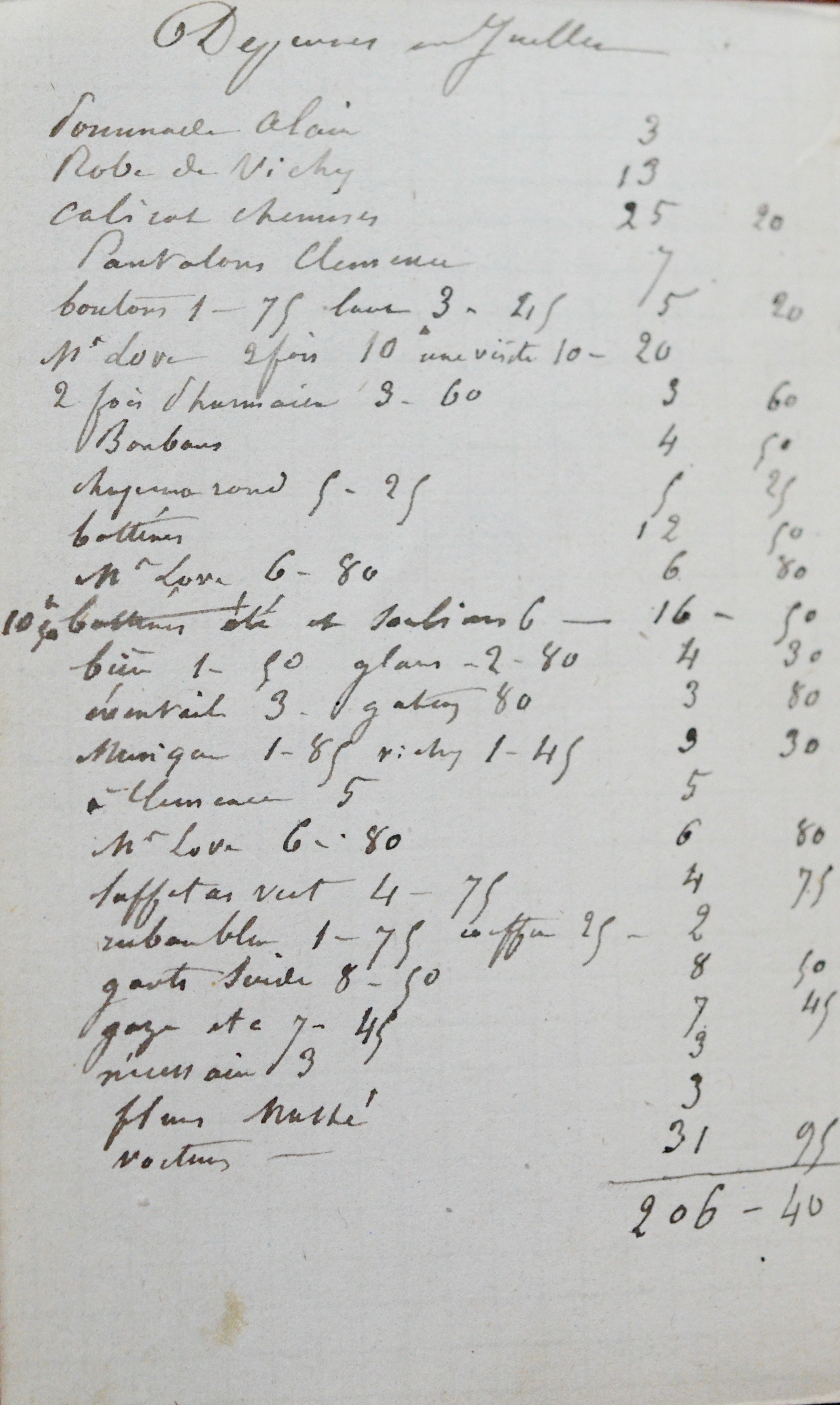 2-Comptes : «Mes recettes et mes dépenses depuis Juillet 1867 jusqu’à la n de Xbre 1872». 165 pp. écrites. Dépenses : exposition, omnibus, satin vert, soie grise, peignes, lacets, hôtel de Dieppe, parmesan, gruyère, riz, œufs, cravate, eau de Cologne, bas laine rouge, à Clémence bonbons, Robe pour Clémence etc.