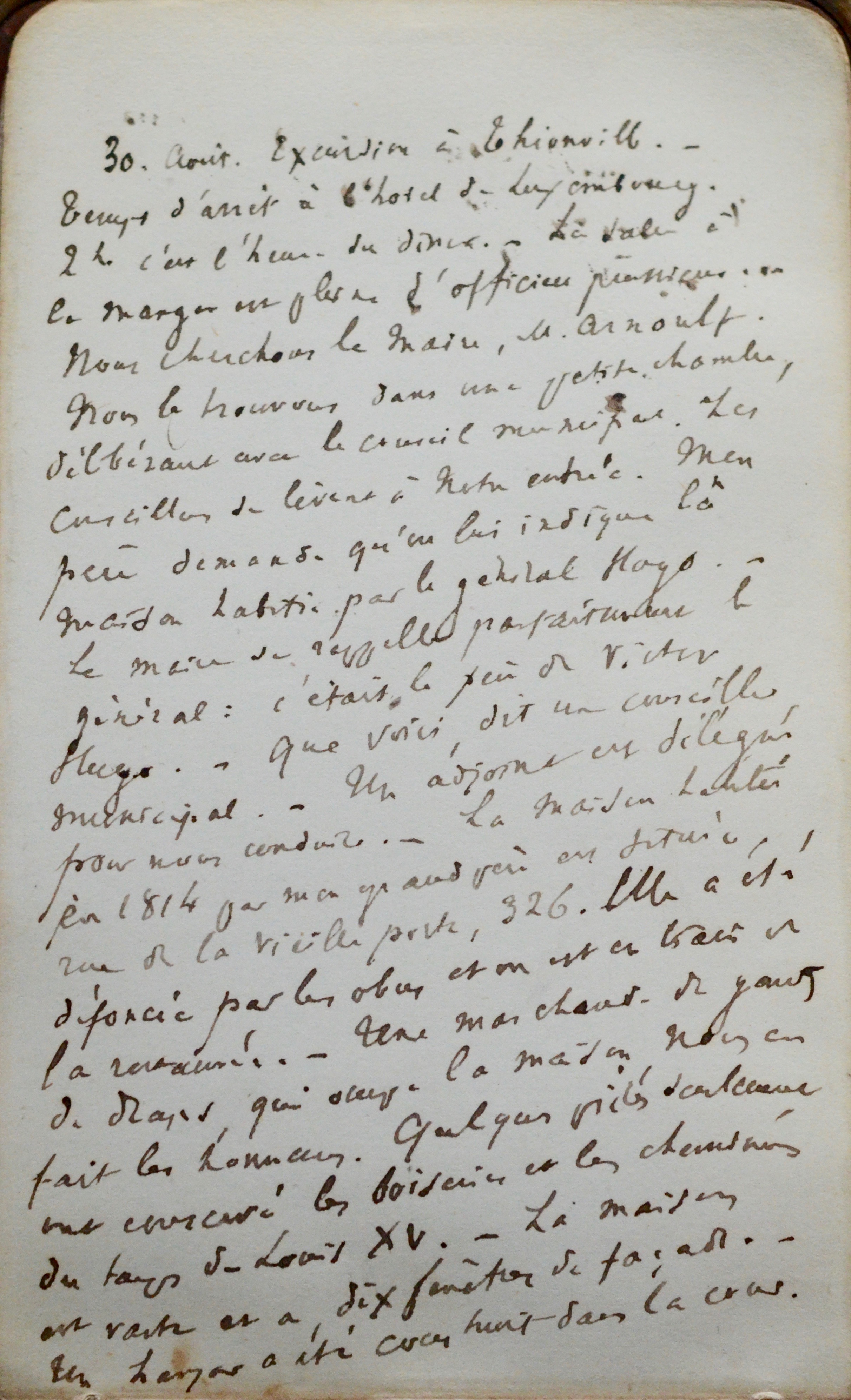 3-Carnet de bord avec relation journalière des faits et gestes de Meurice (35 pages écrites) : «30. Aout. Excursion à Thionville [suivi d’un long récit de la journée]», «Le 3 septembre. Visite à Nenig, par Remich. Remise, joli petite ville au bord de la Moselle [...]», etc. Commentaires sur l’actualité (réception par le Président de la République de l’héritier de la couronne d’Angleterre), Le Constitutionnel, le Daily News, Adolphe Thiers, Joachim Murat, etc.