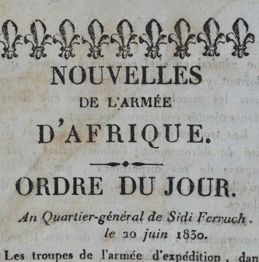 Quatre rares imprimés donnant une relation des événements de l'expédition d'Alger : "Nouvelles de l'armée d'Afrique" (20 juin 1830) ; "Expédition d'Afrique. Baie d'Alger" ; deux exemplaire des "Nouvelles d'Alger" des 2 et 12 septembre 1830.