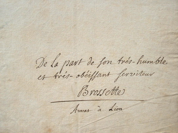 Page de dédicace de Claude Brossette : «Pour monsieur Bronod, avocat au Conseil, de la part de son très humble et très obéissant serviteur, Brossette, avocat à Lion».