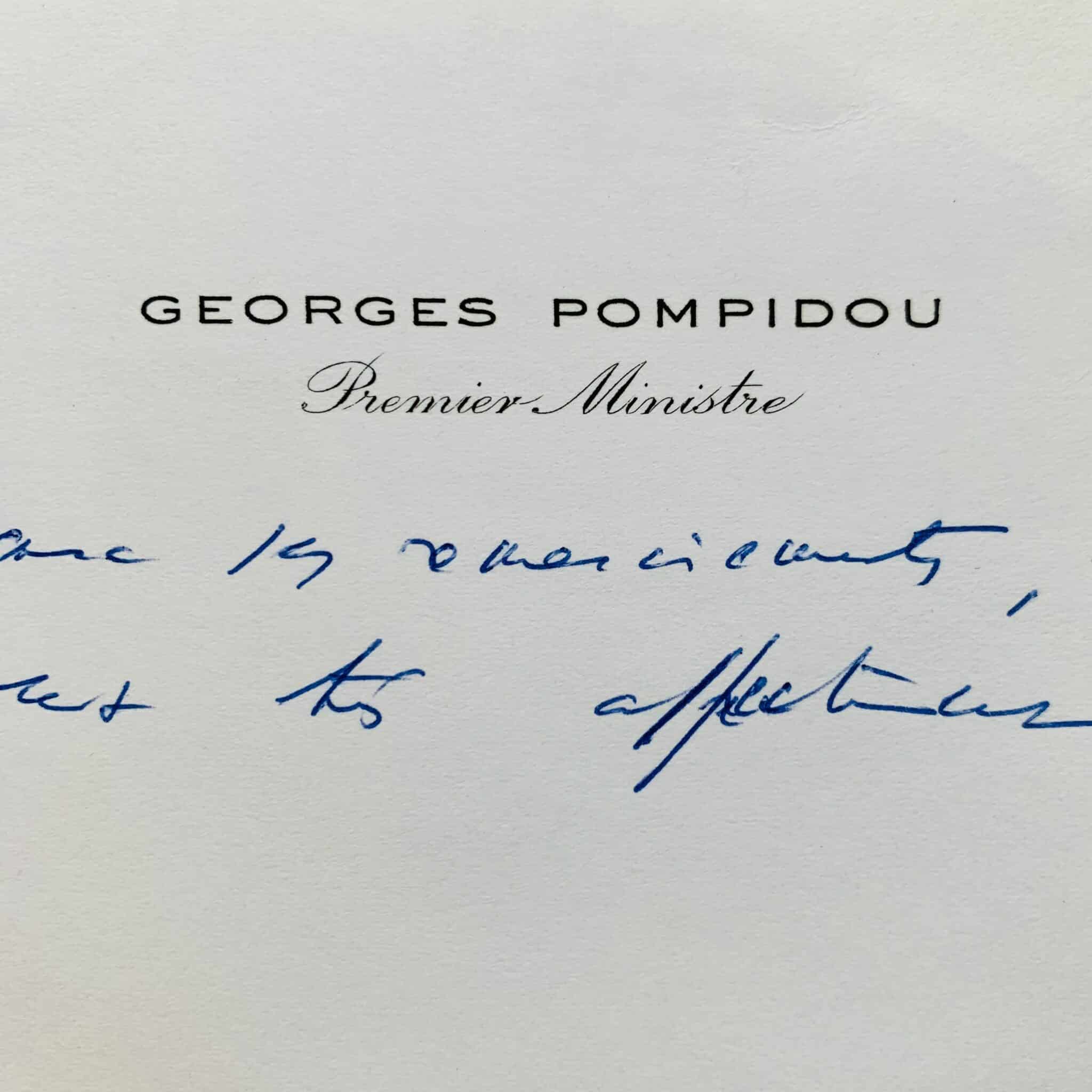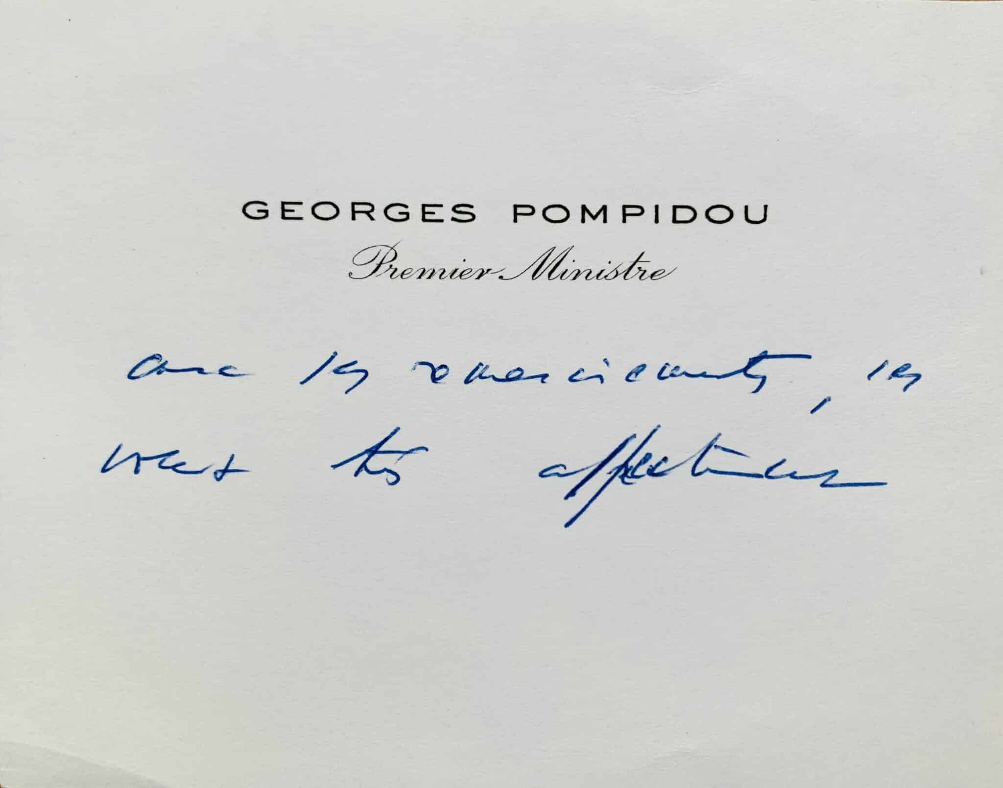 Sur sa carte de visite de premier ministre, Georges Pompidou adresse "ses remerciements, ses voeux très affectueux".