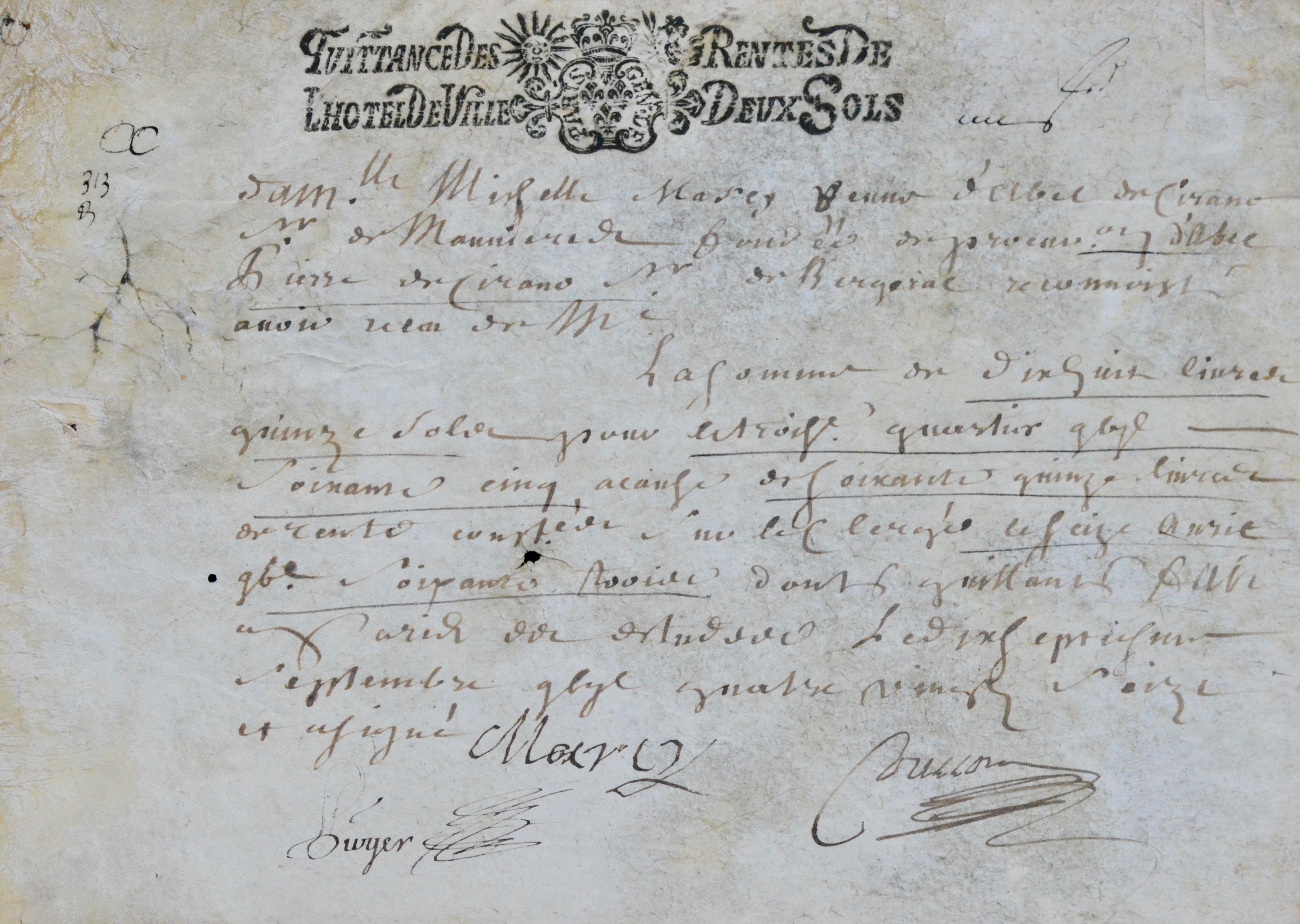 « Michelle Marcy veuve d'Abel de Cirano Sr de Mauvières fondée de procuration d'Abel Pierre de Cirano sieur de Bergerac » reconnaît avoir reçu la somme de 18 livres 15 sols pour trois quartiers de rente sur le clergé.