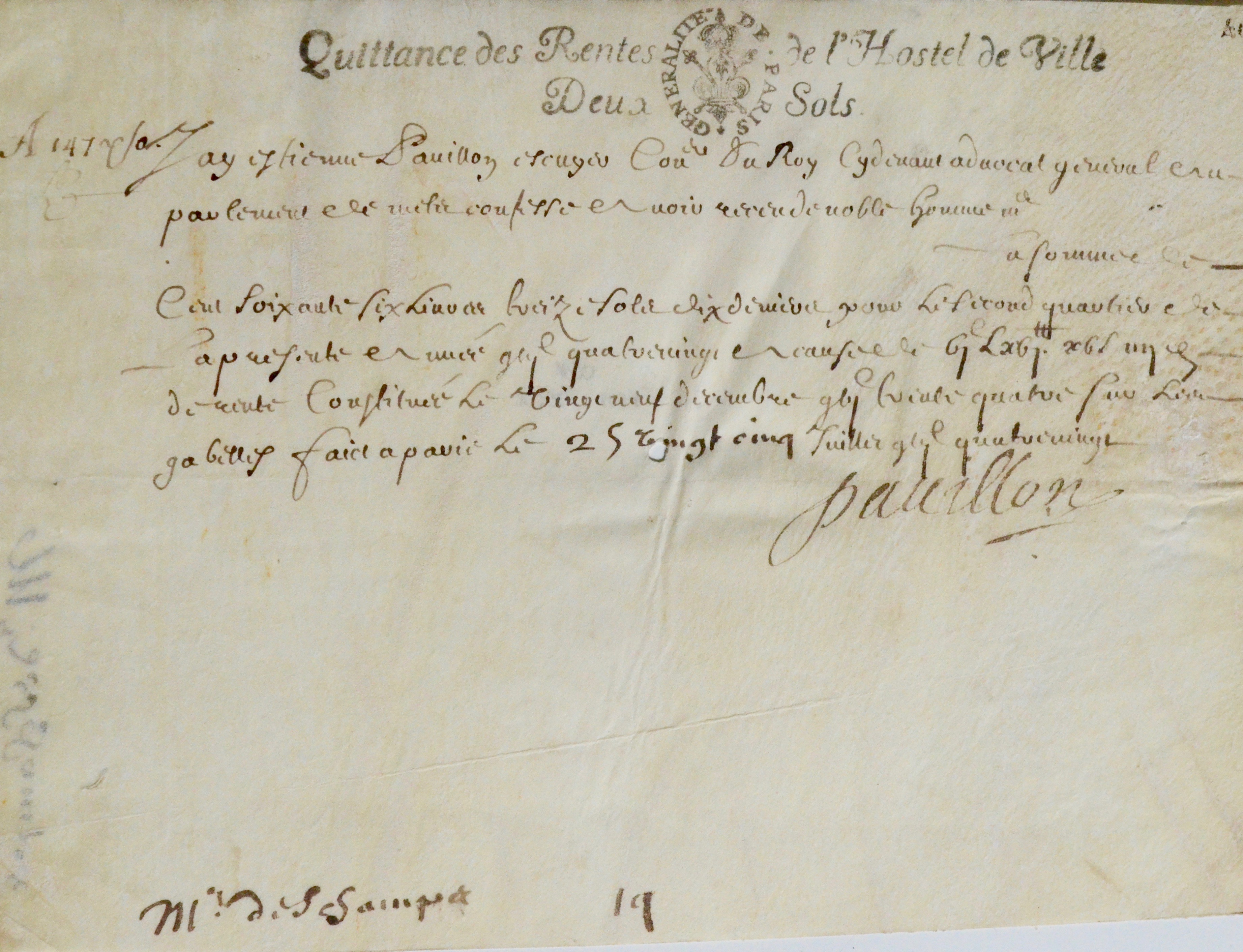 Encre brune sur vélin. Tampon de "Quittance des Rentes de l'Hostel de Ville - Deux sols" en-tête.